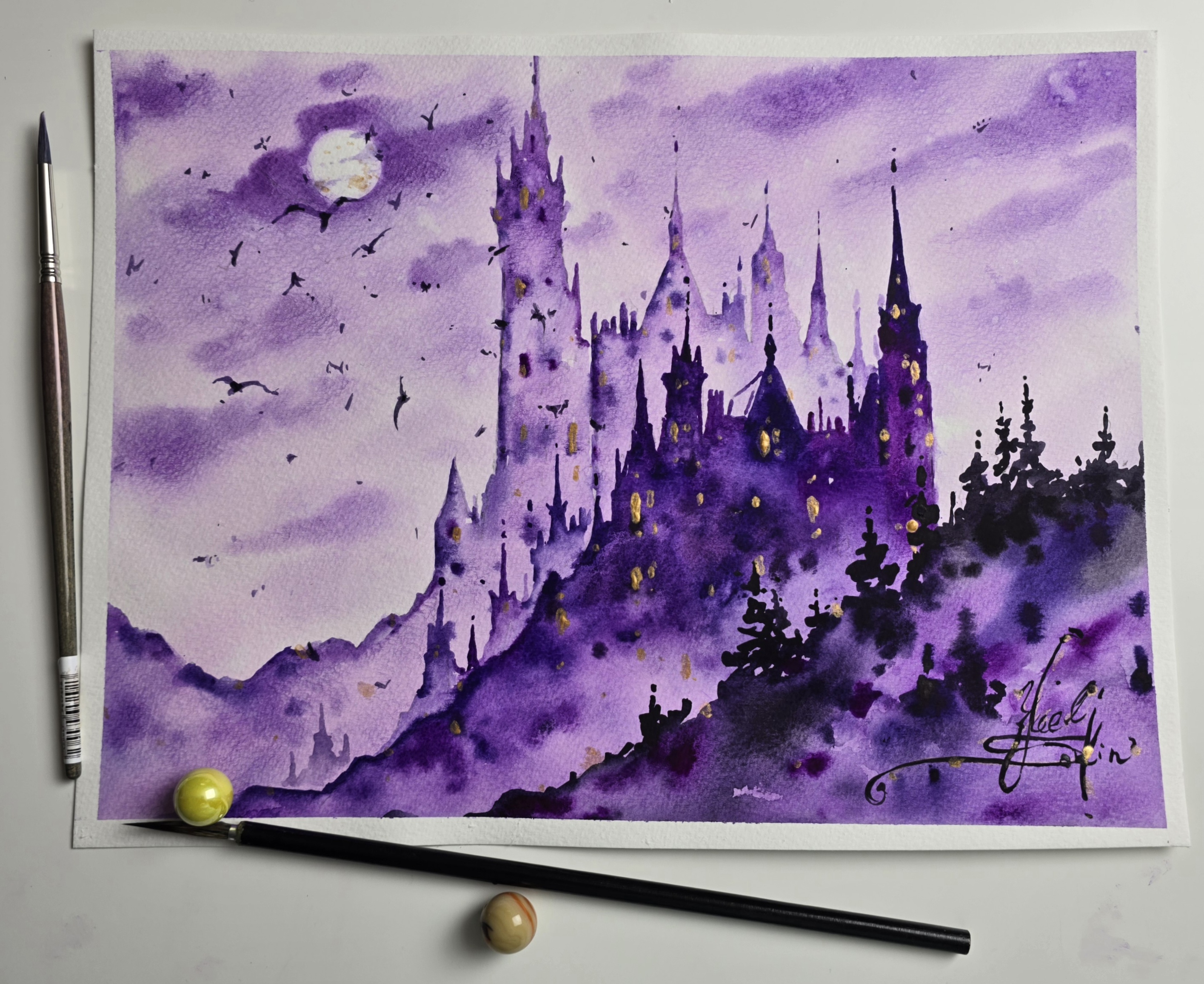 Original Watercolor Gothic Castle Painting - Purple Fantasy Wall Art