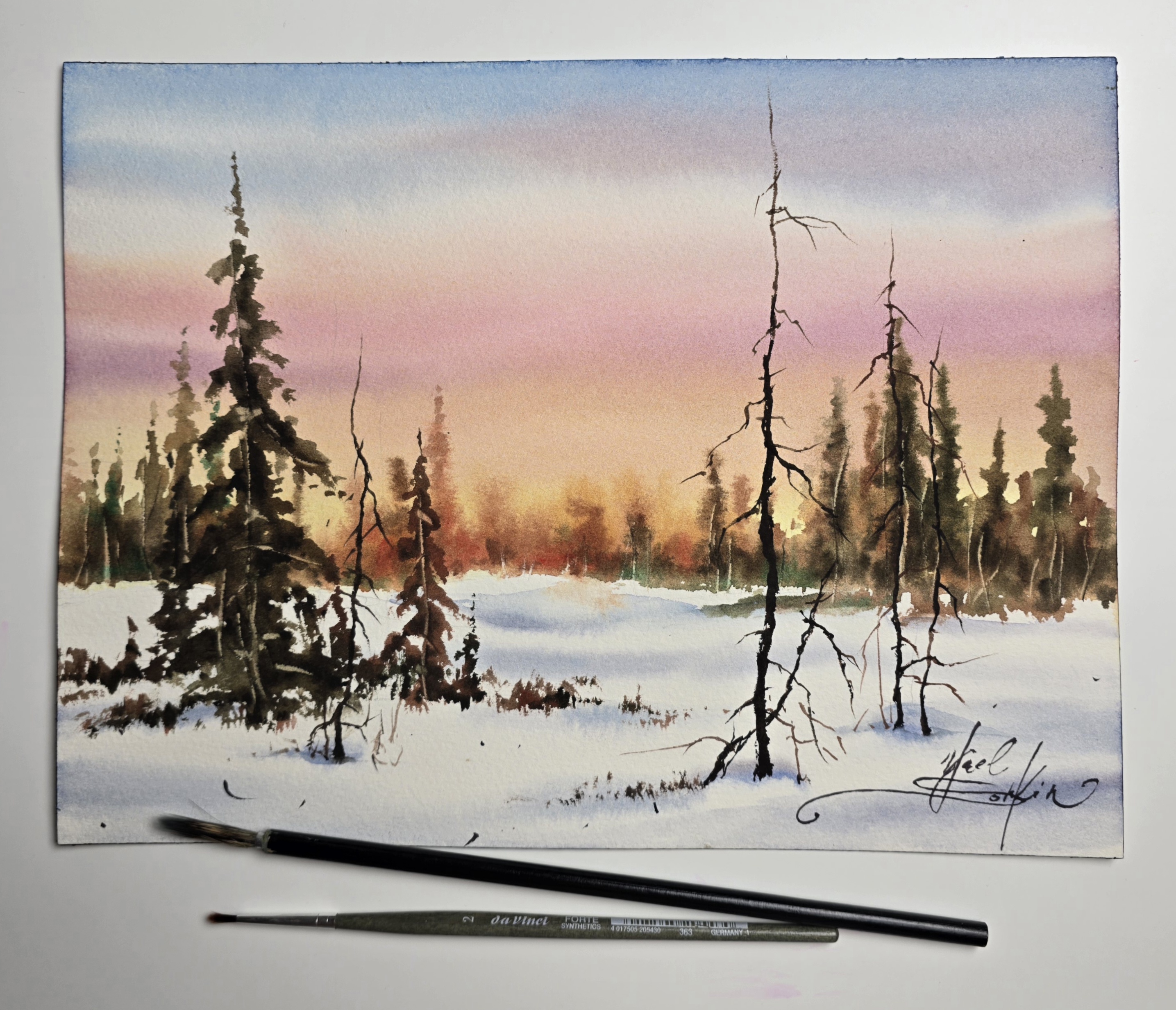 Original Watercolor Winter Sunset Landscape Painting - Pine Trees Wall Art