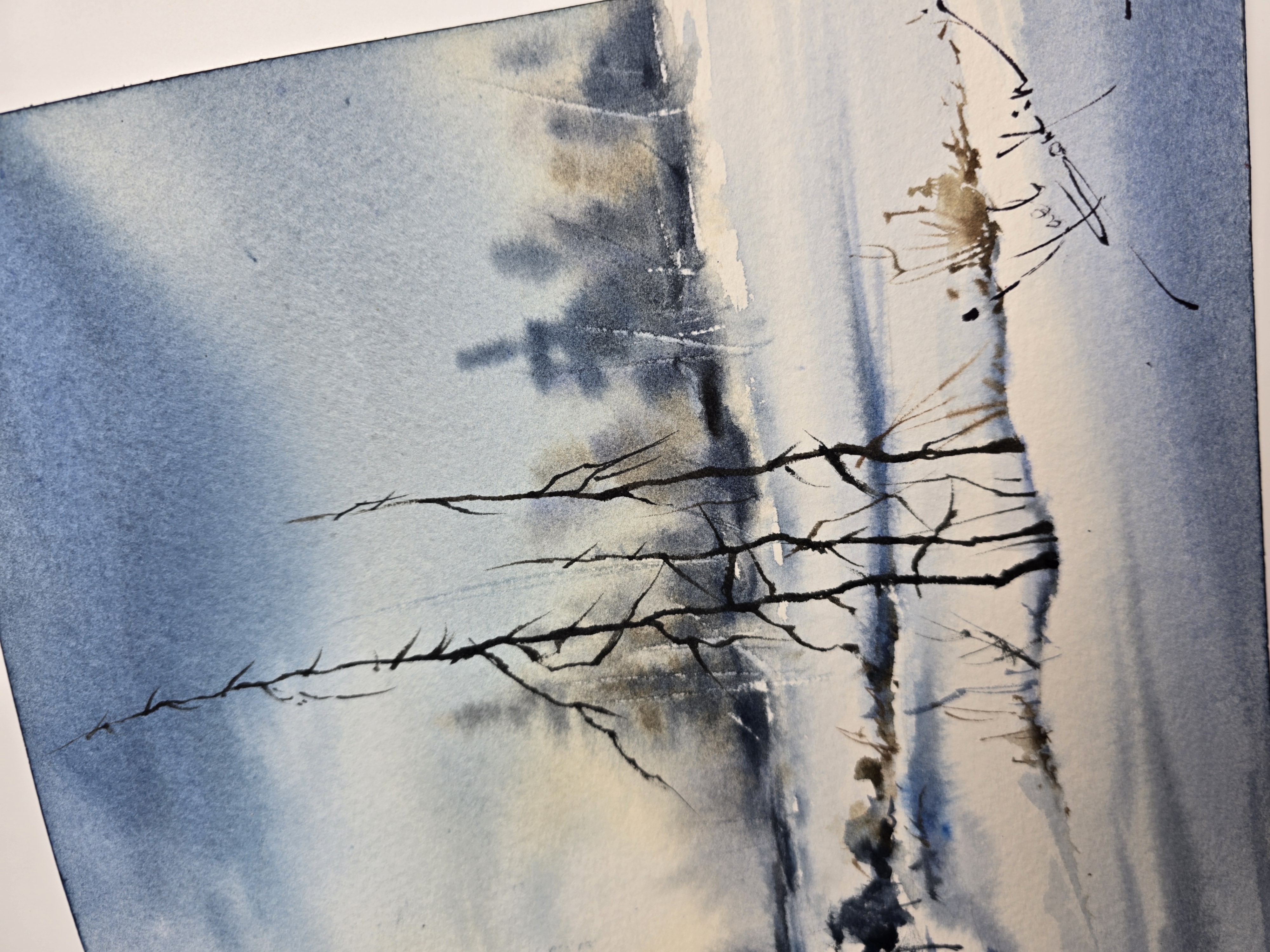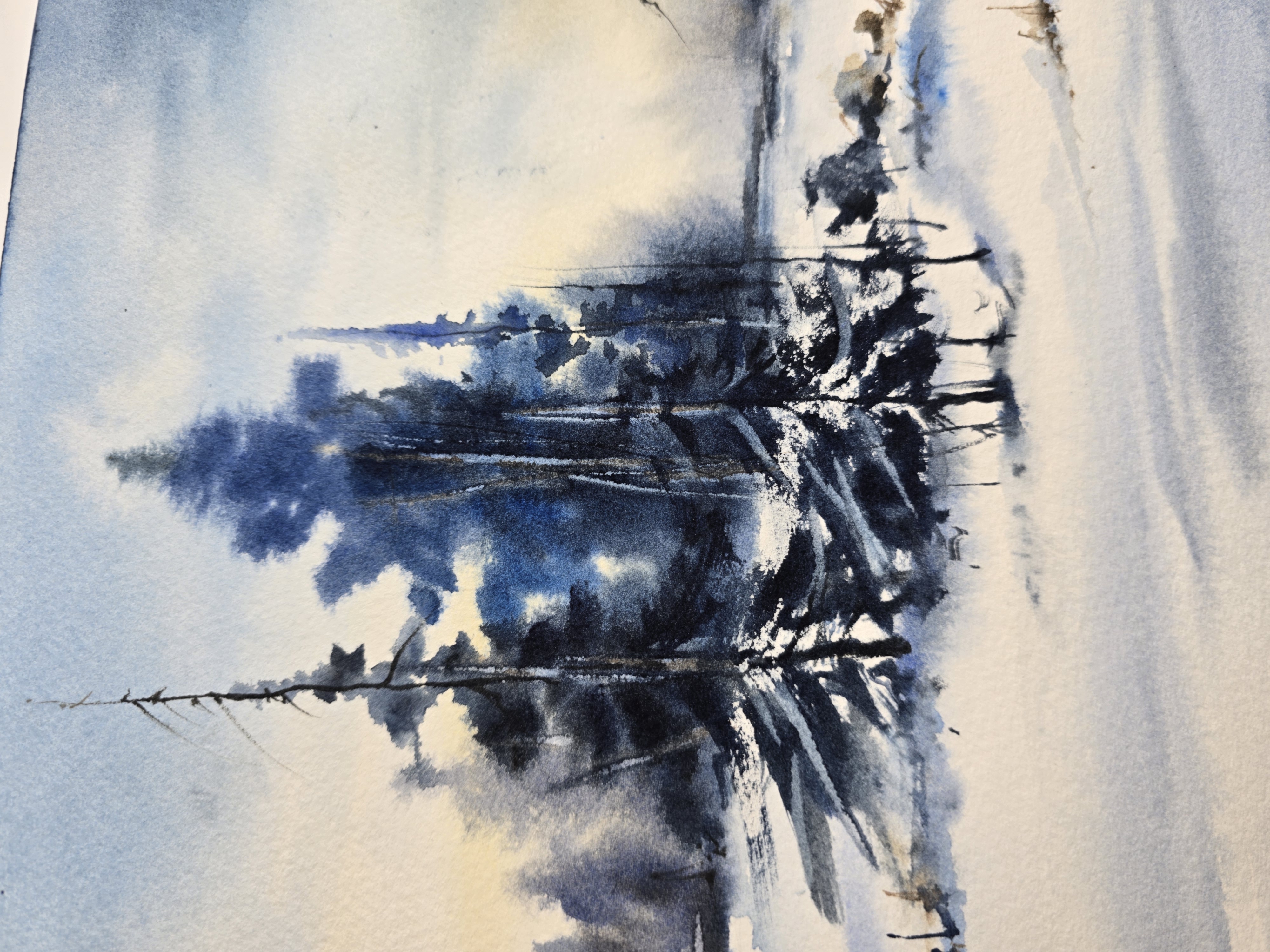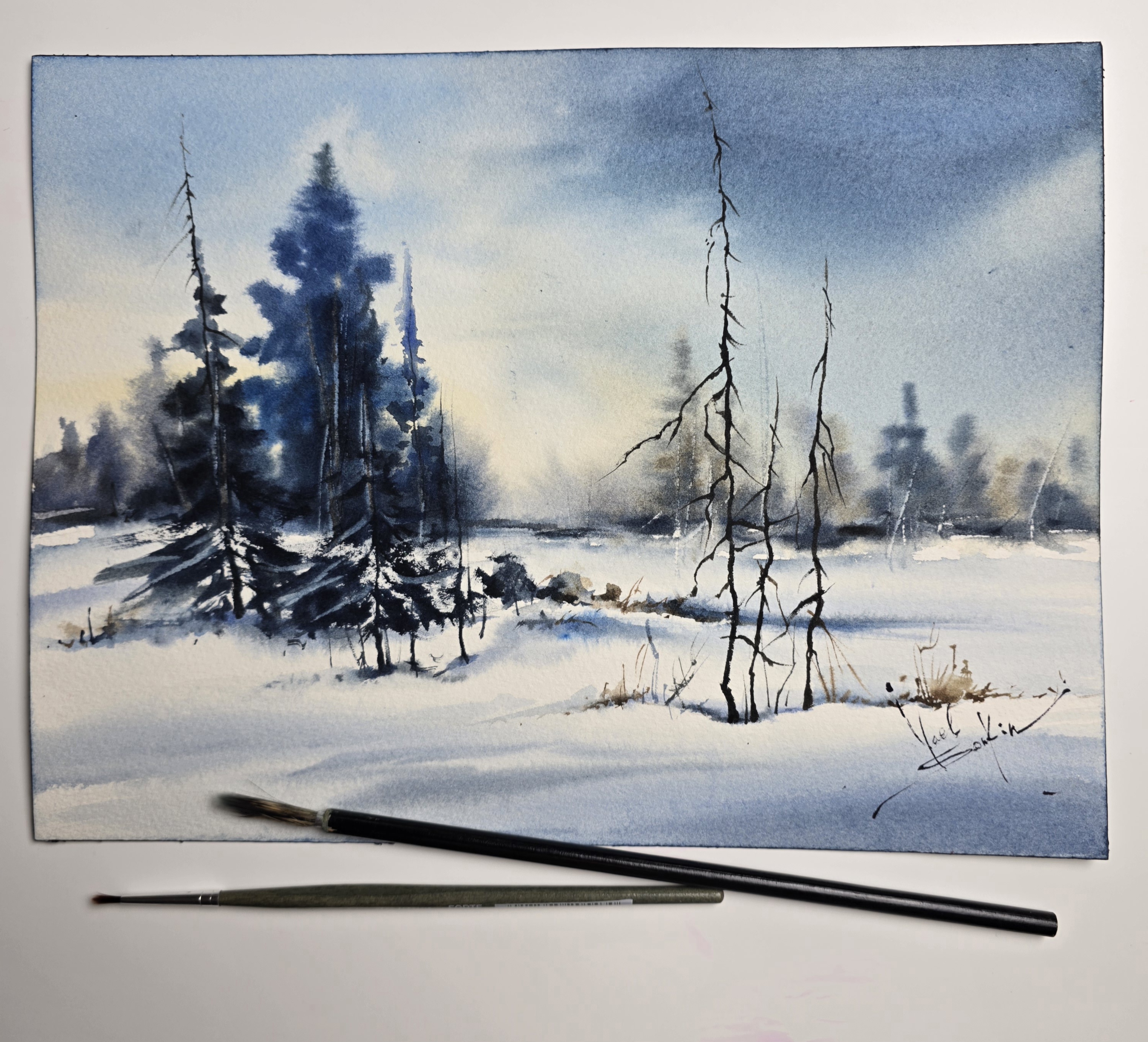 🎨“Silent Winter Morning” is an original watercolor landscape by Yael Natali, capturing the quiet poetry of a snowy forest at dawn.