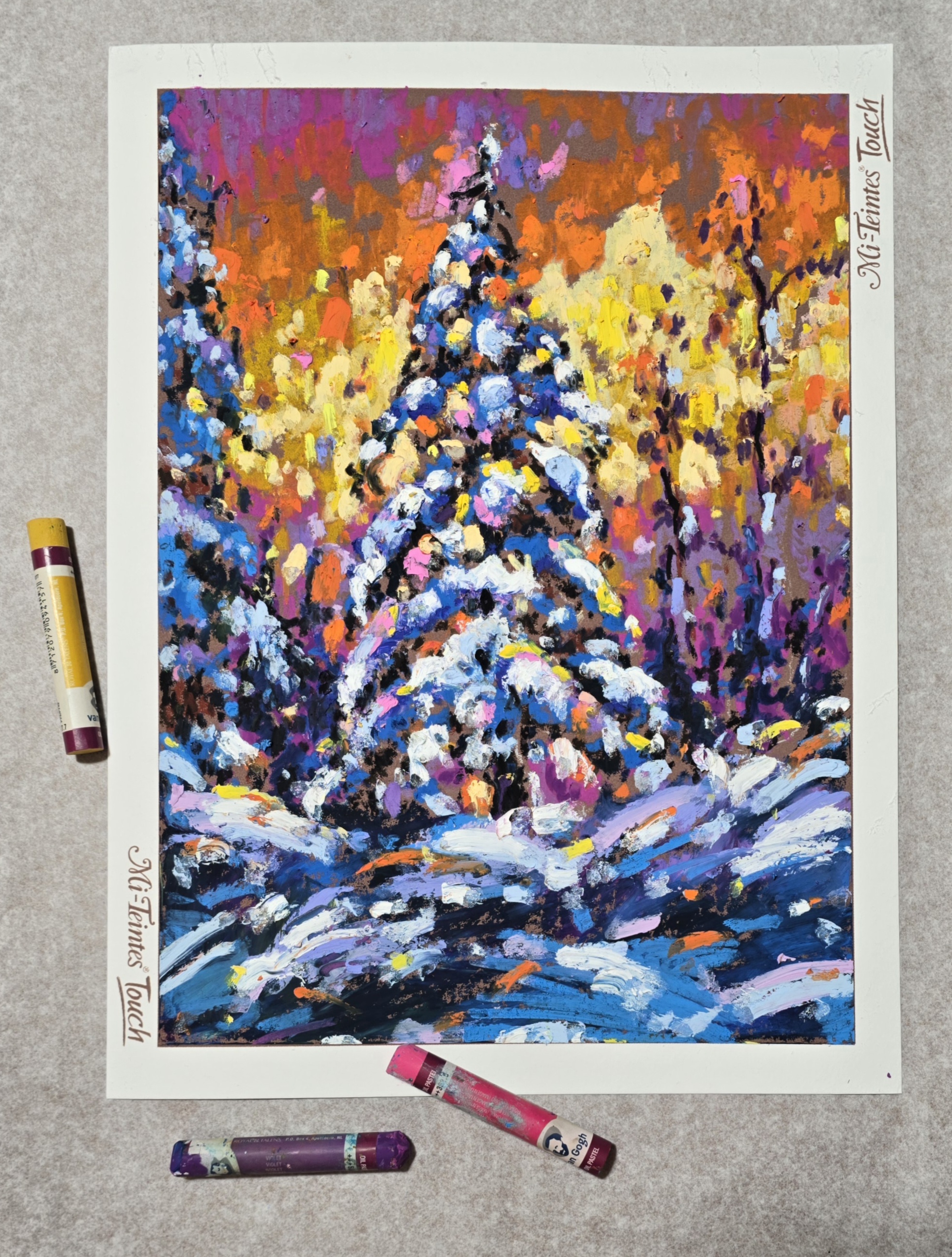 🎨"Winter Glow" is an expressive oil pastel landscape by Yael Natali, capturing the quiet beauty of a snowy forest at sunset. Rich textures and vibrant contrasts between cool blues and warm oranges convey both the chill of winter and the warmth of light filtering through the trees.