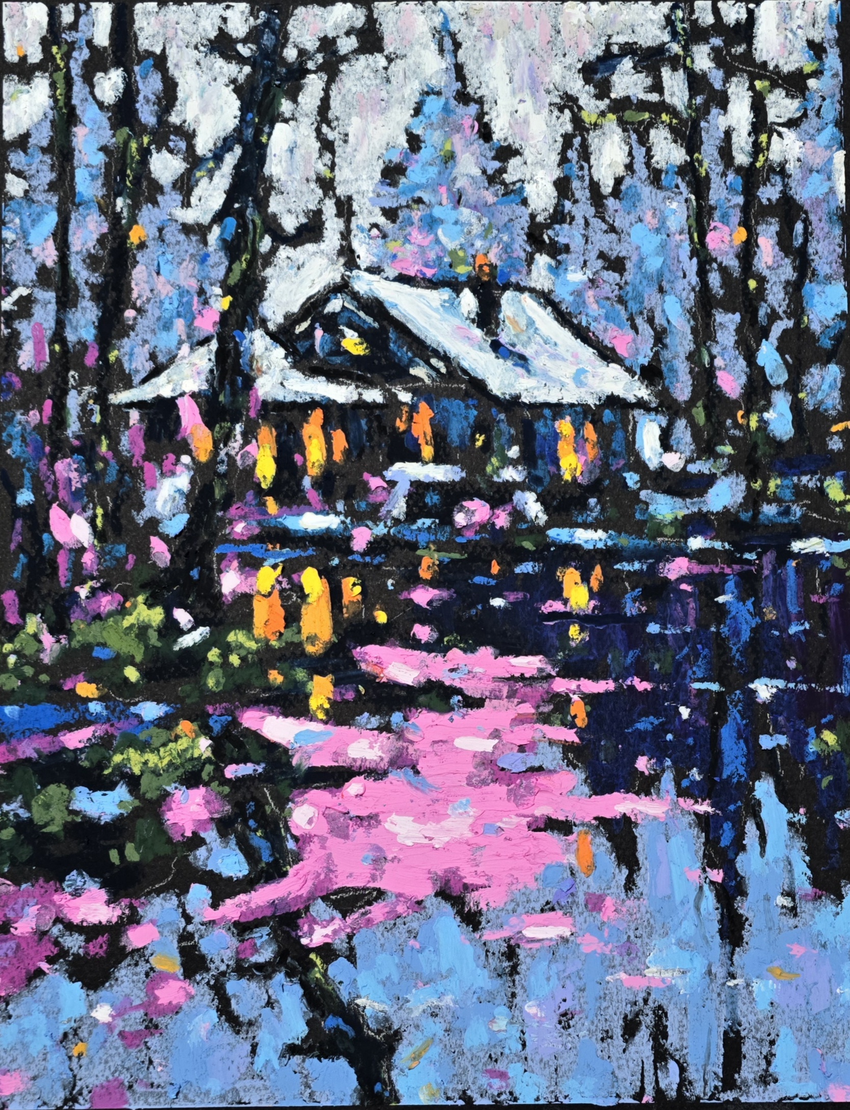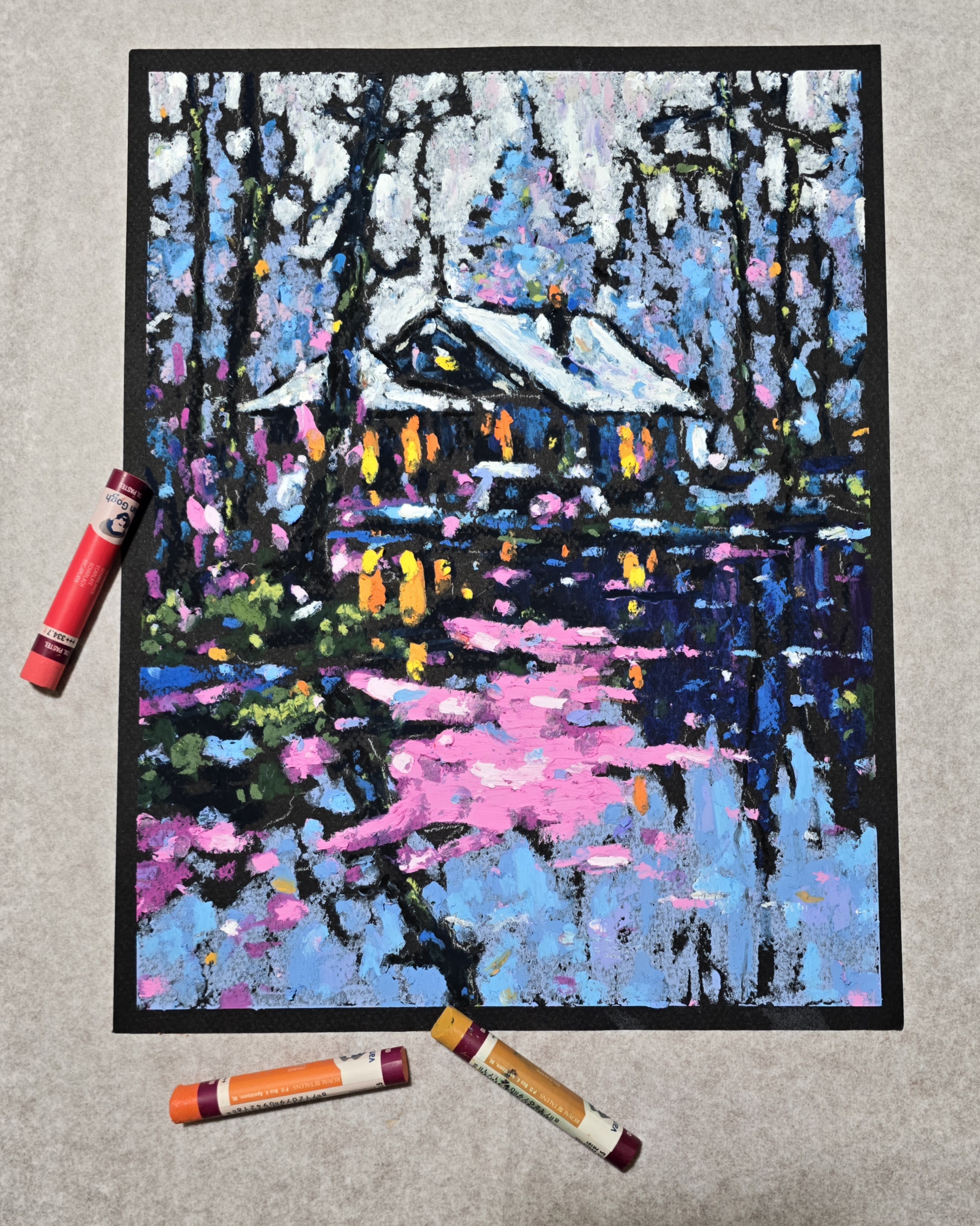 🎨This vibrant oil pastel painting captures a magical winter evening with a glowing cabin surrounded by tall snowy trees and shimmering reflections on the water.