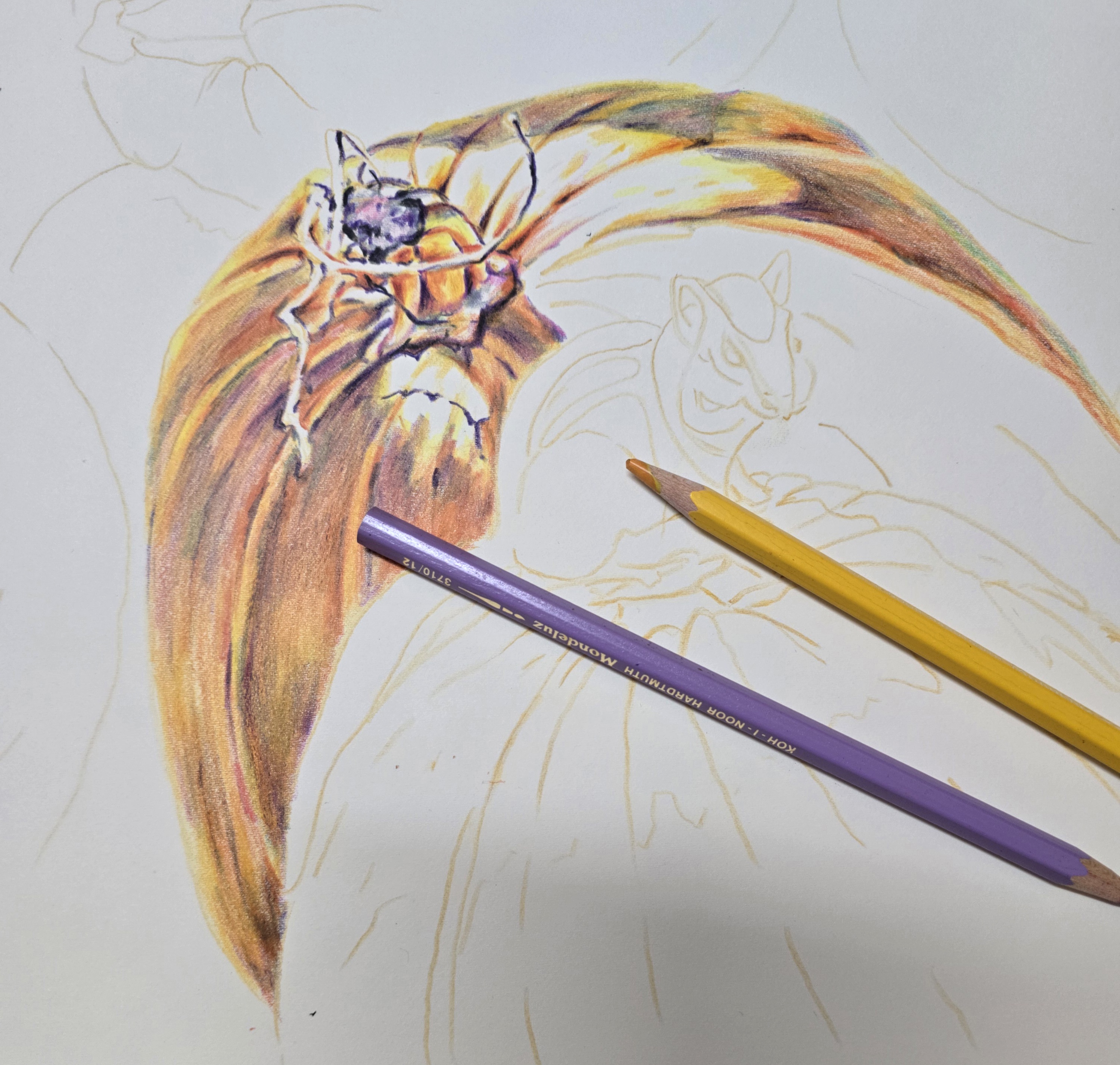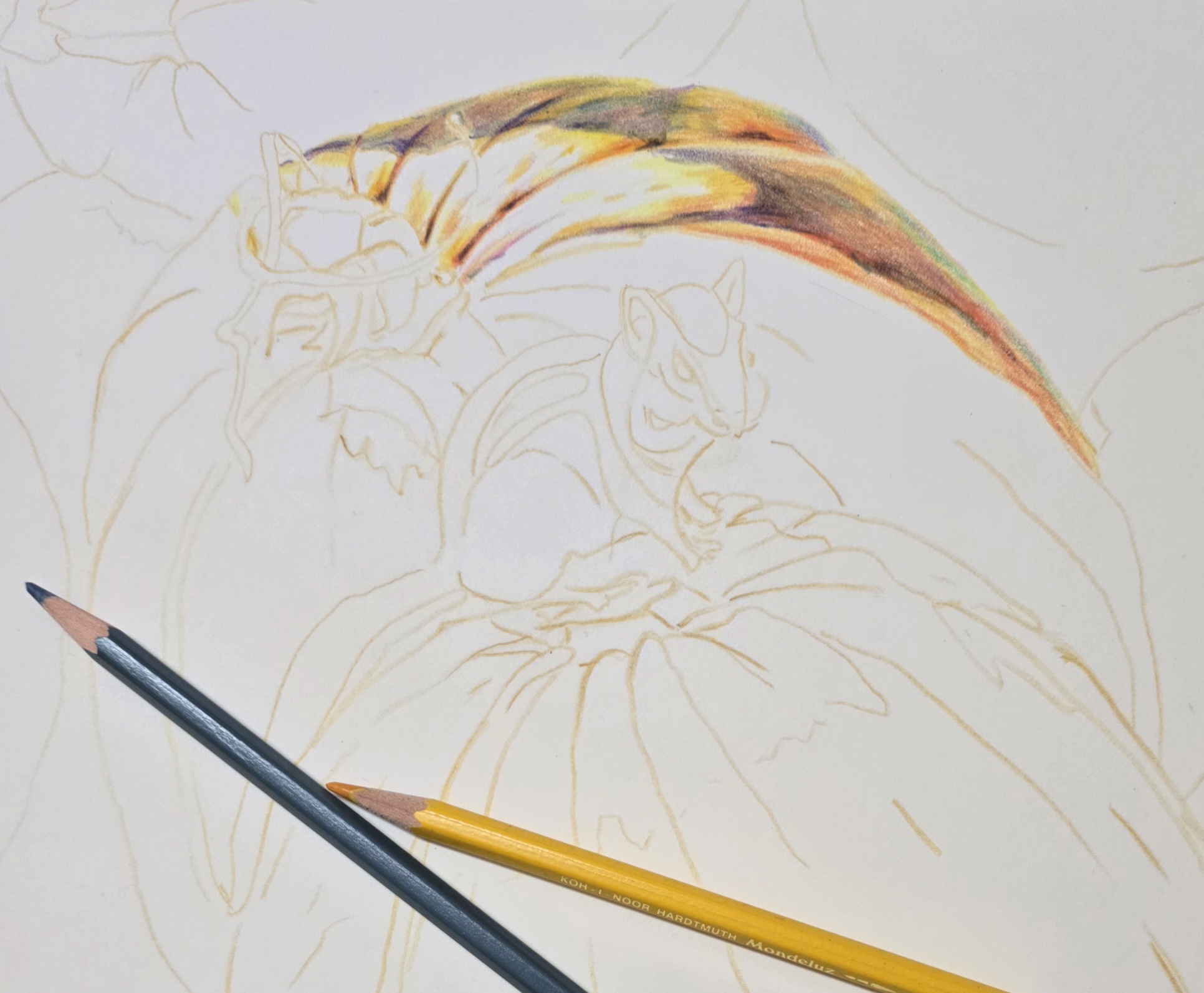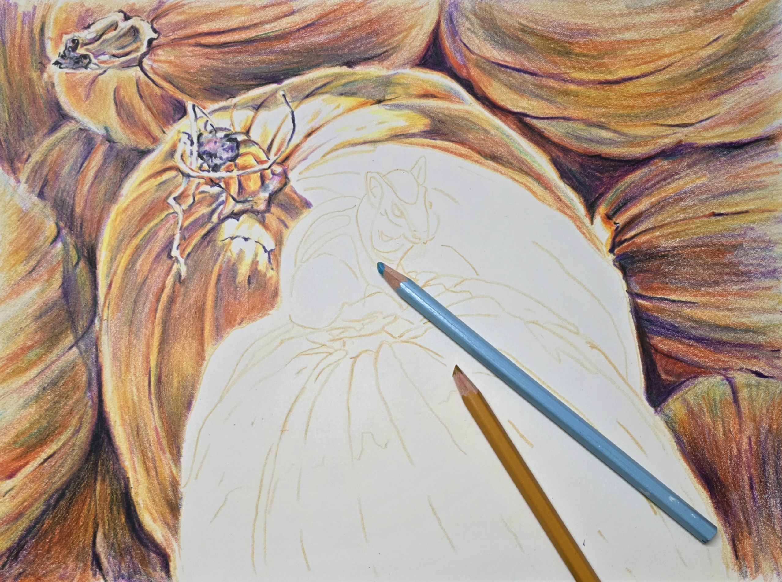🎨This original watercolor pencil drawing by artist Yael Natali features a charming chipmunk sitting on warm, sunlit pumpkins, surrounded by rich autumn tones and soft, detailed textures. A vibrant and cozy fall composition that brings warmth and character to any space.