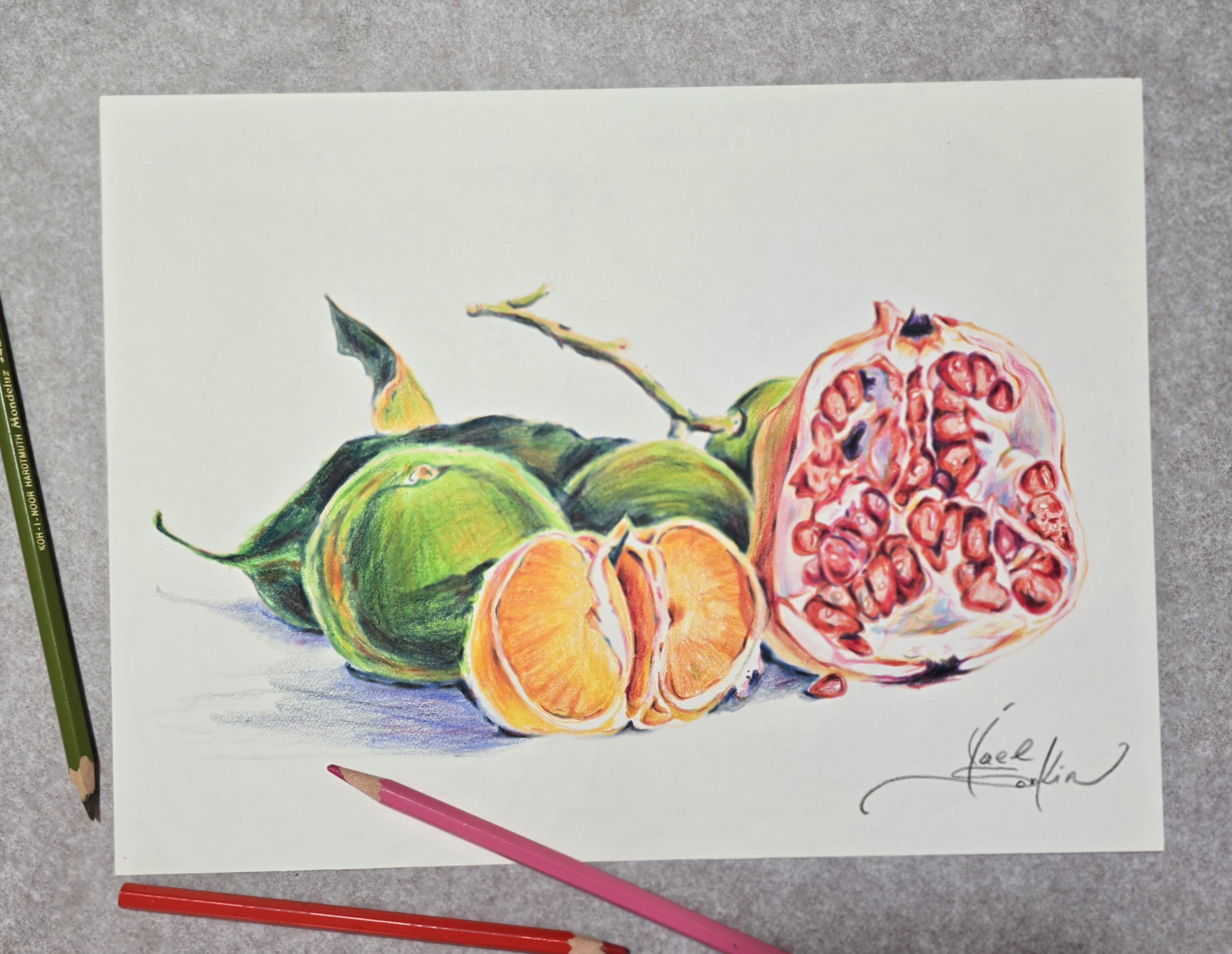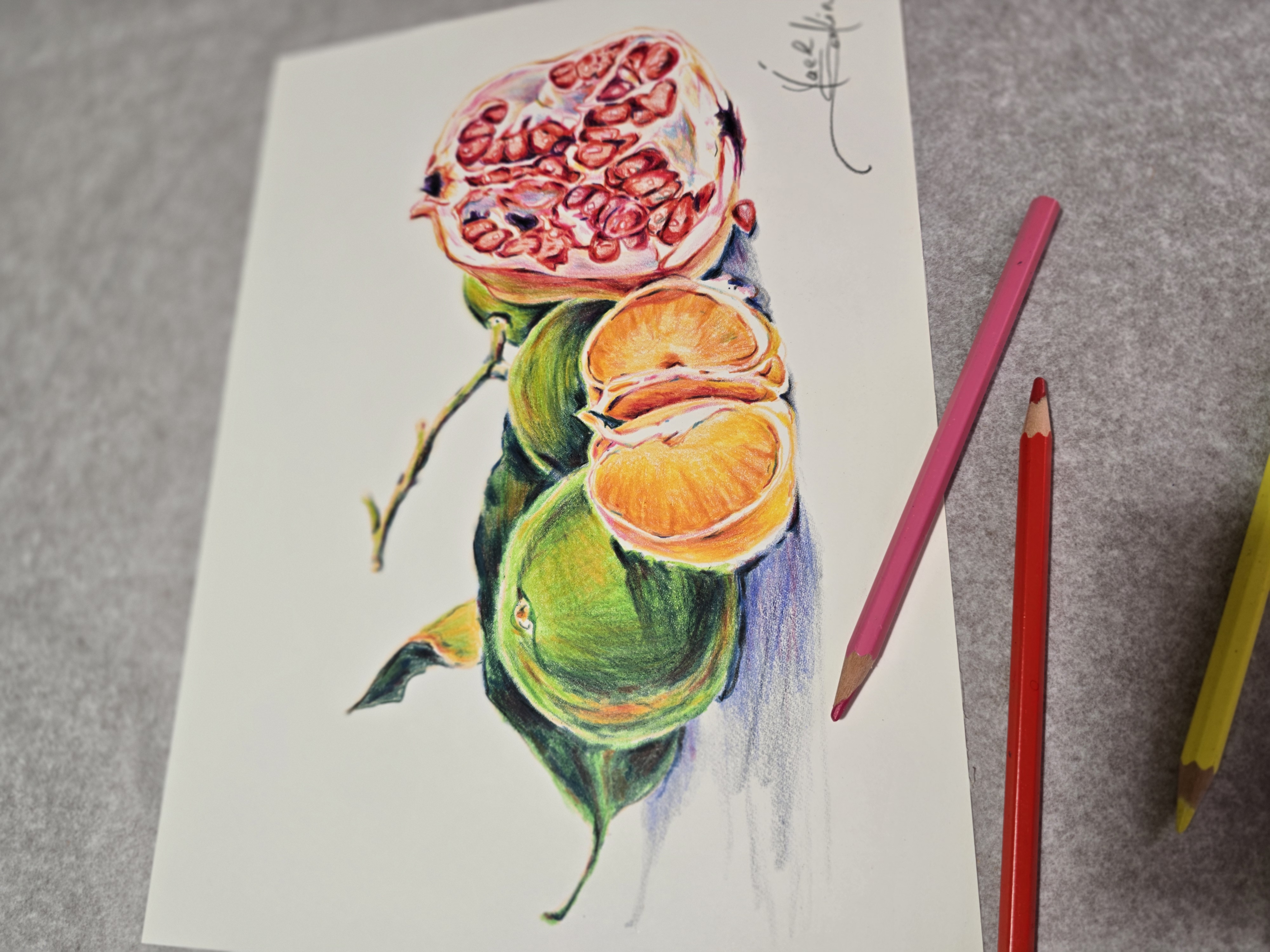 🎨This detailed watercolor pencil still life captures the natural beauty of fresh mandarins and a richly textured pomegranate.