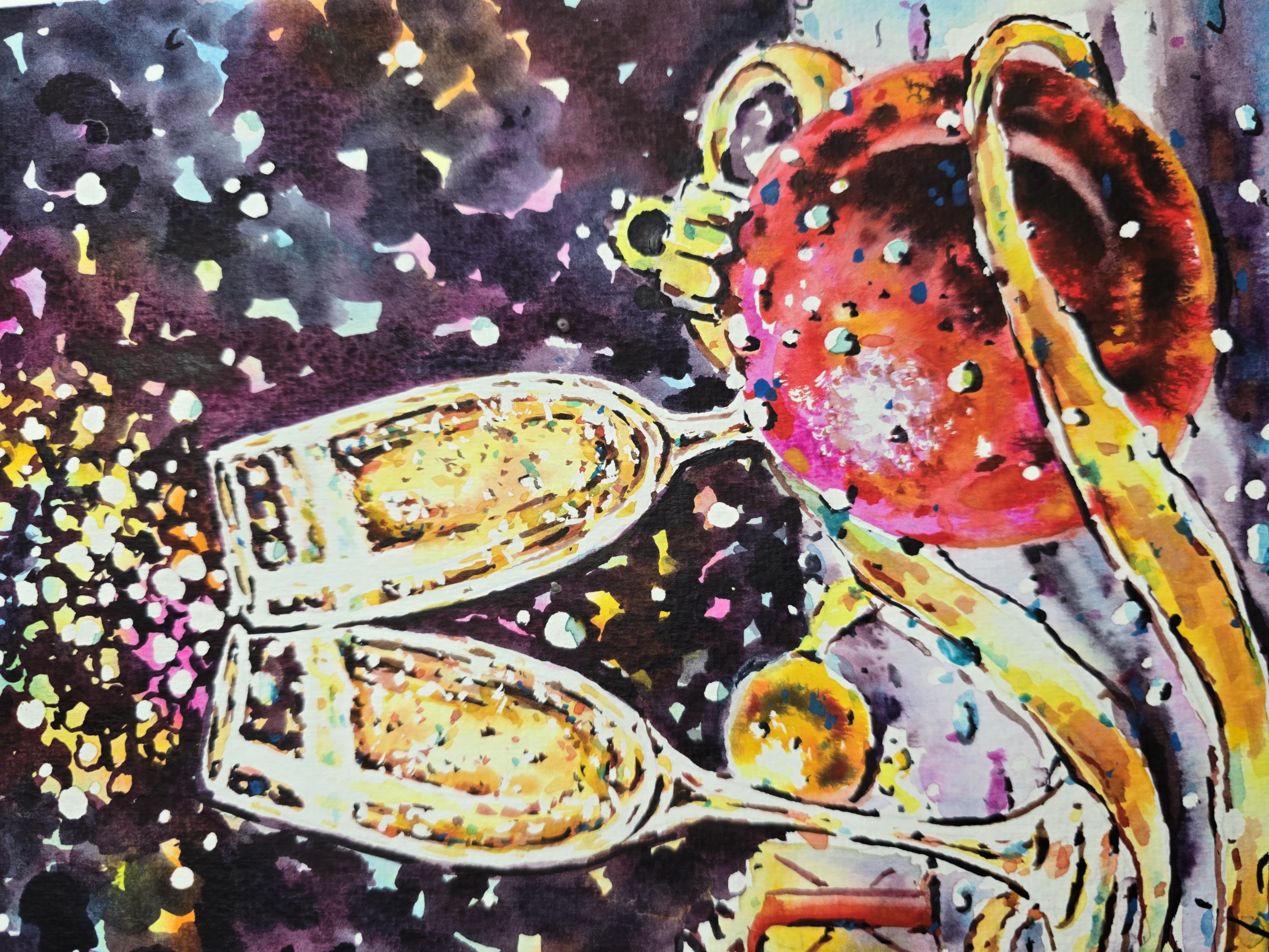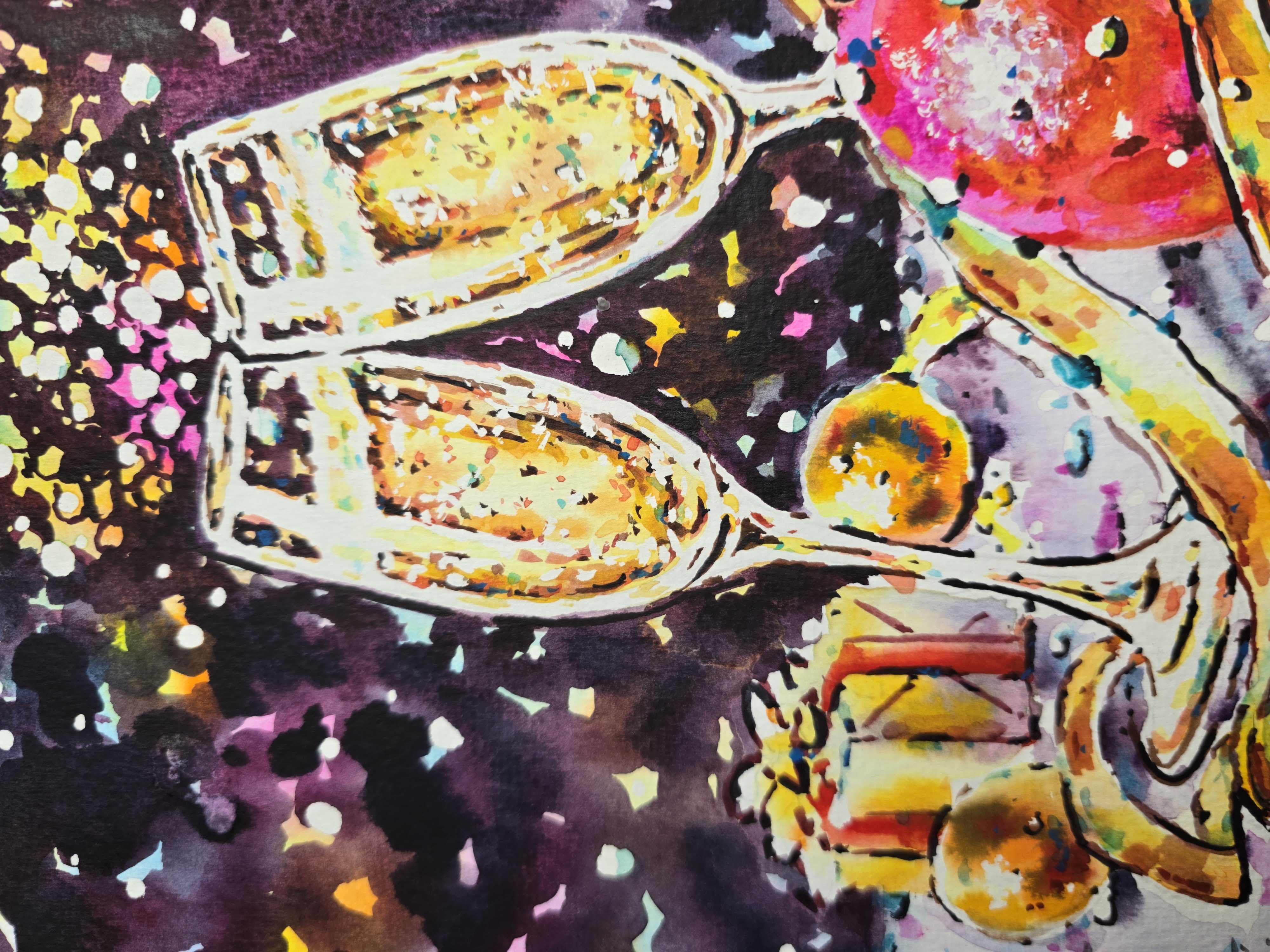 🖌️Expressive watercolor textures, rich contrasts, and shimmering light effects create a sense of movement and excitement. The dark background enhances the golden glow of champagne and festive details, making the composition feel lively, warm, and full of energy.