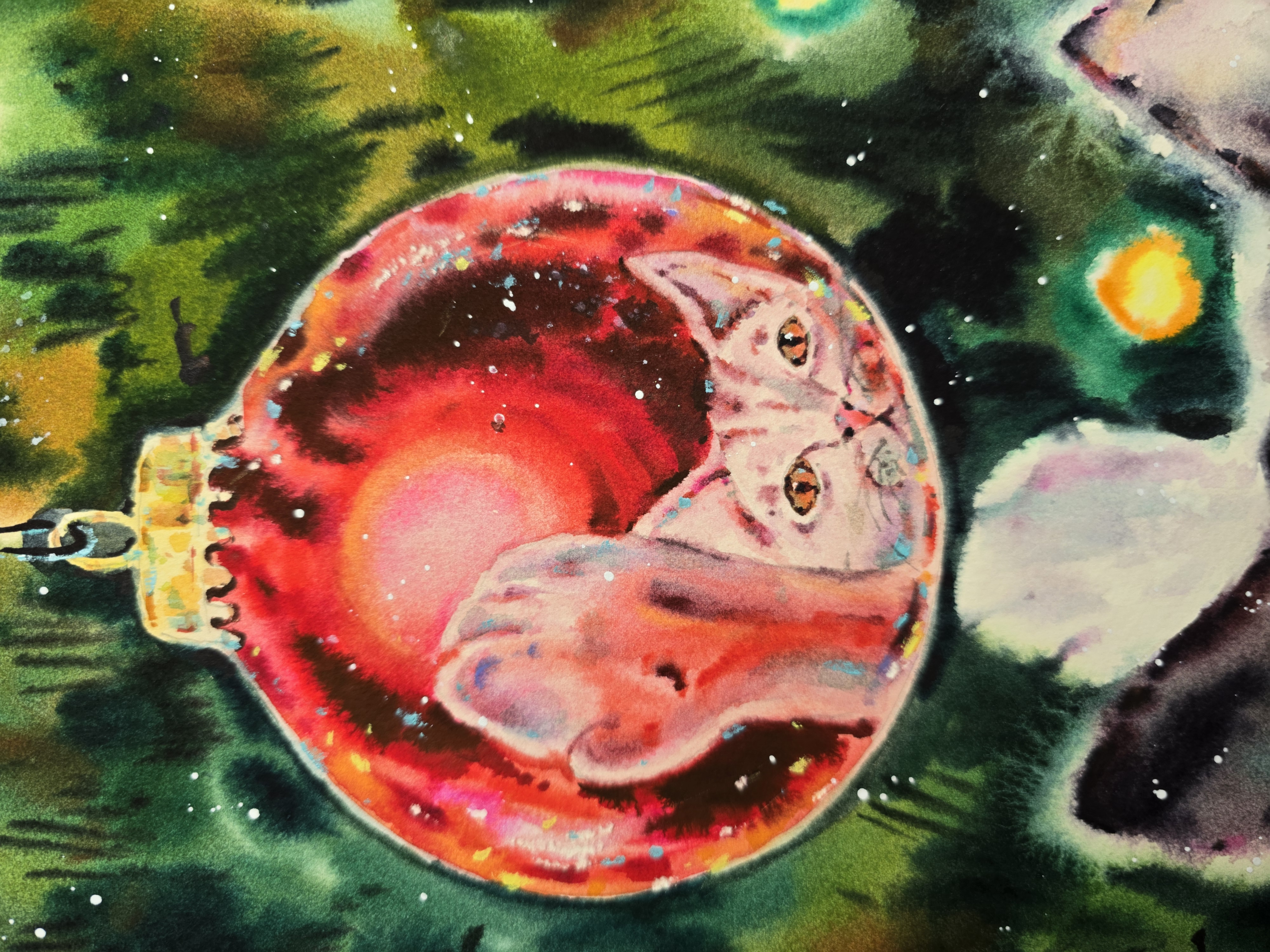 🖌️Loose watercolor washes, glowing reds and greens, and gentle splashes of light create a dreamy atmosphere filled with warmth and holiday charm. The painting combines festive spirit, coziness, and love for animals, making it both joyful and heart-warming.