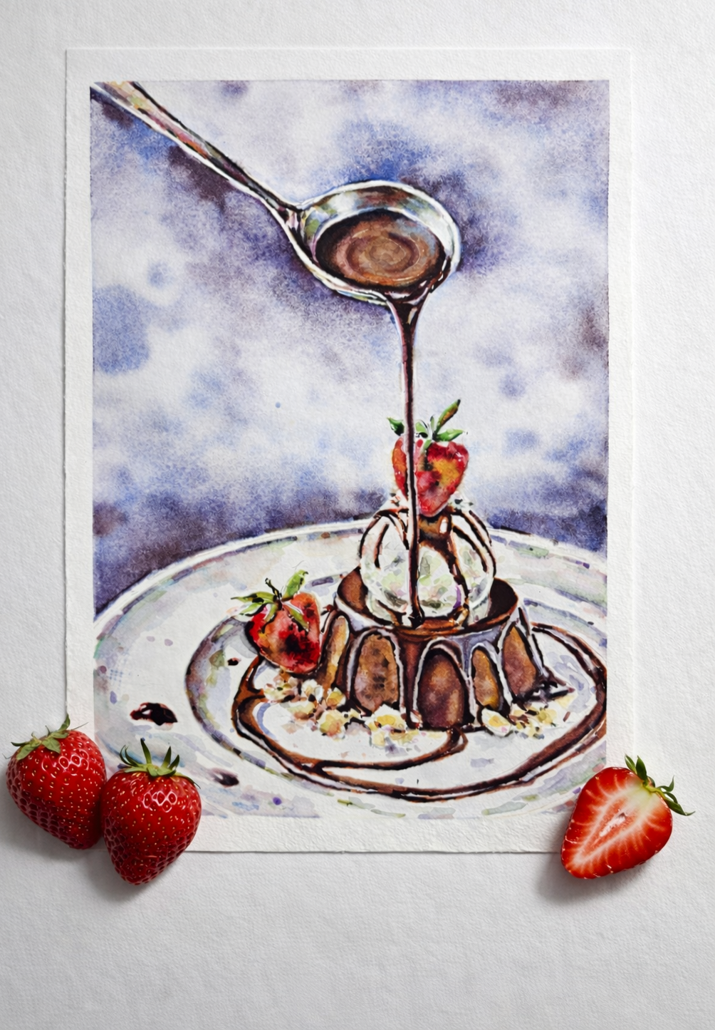 Original Watercolor Chocolate Dessert with Strawberries - Food Wall Art
