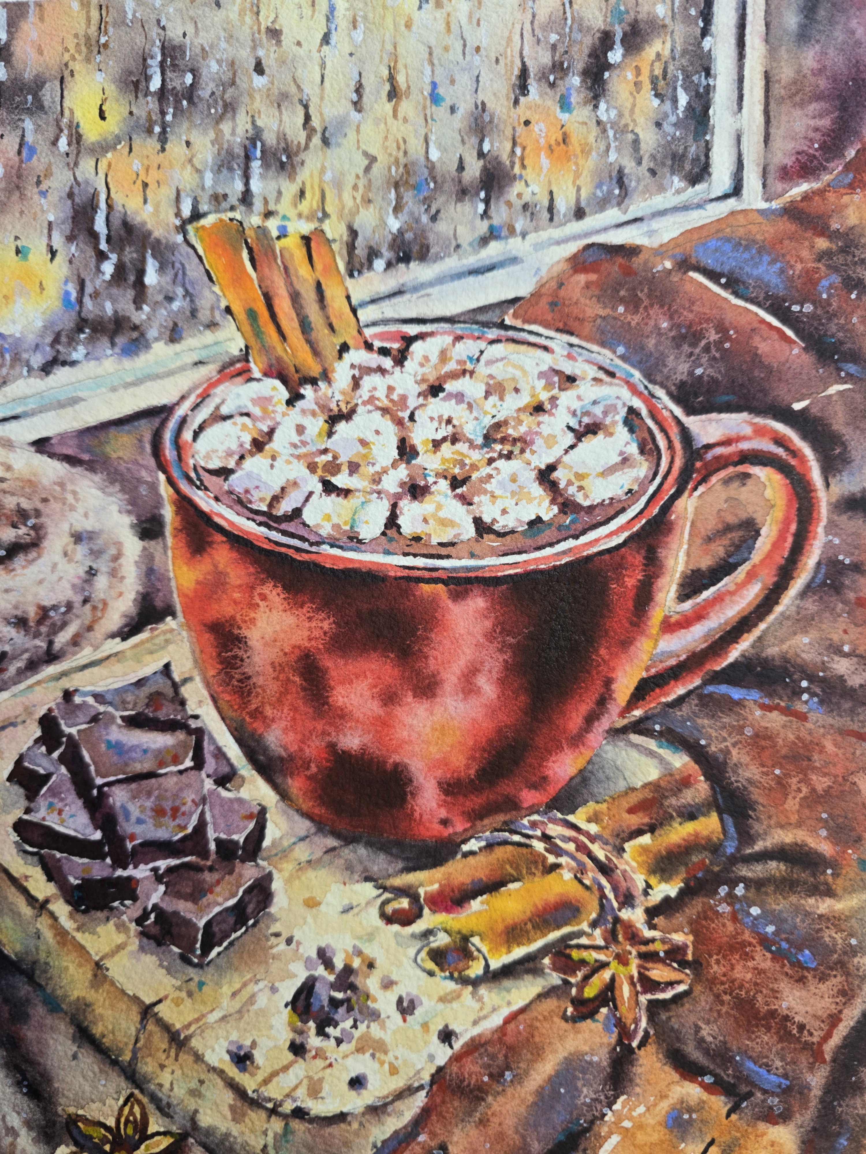 🎨A deep red cup of hot cocoa filled with marshmallows sits on a wooden board, accompanied by cinnamon sticks, pieces of dark chocolate, and soft winter textures. Outside the window, rain gently falls, blurring the world beyond and turning the scene inward - calm, slow, and personal.