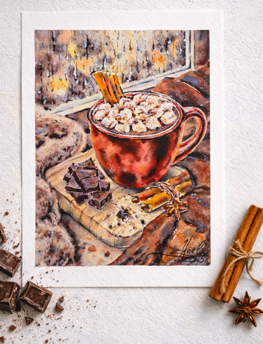 🖌️The watercolor technique allows the colors to flow naturally, creating softness and movement. Warm browns, reds, and creamy whites contrast with the cool tones of the rainy background, enhancing the feeling of coziness. The loose brushstrokes and layered washes invite the viewer to feel not just the image, but the atmosphere — the quiet sound of rain, the warmth of the cup in hands, the pause between moments.