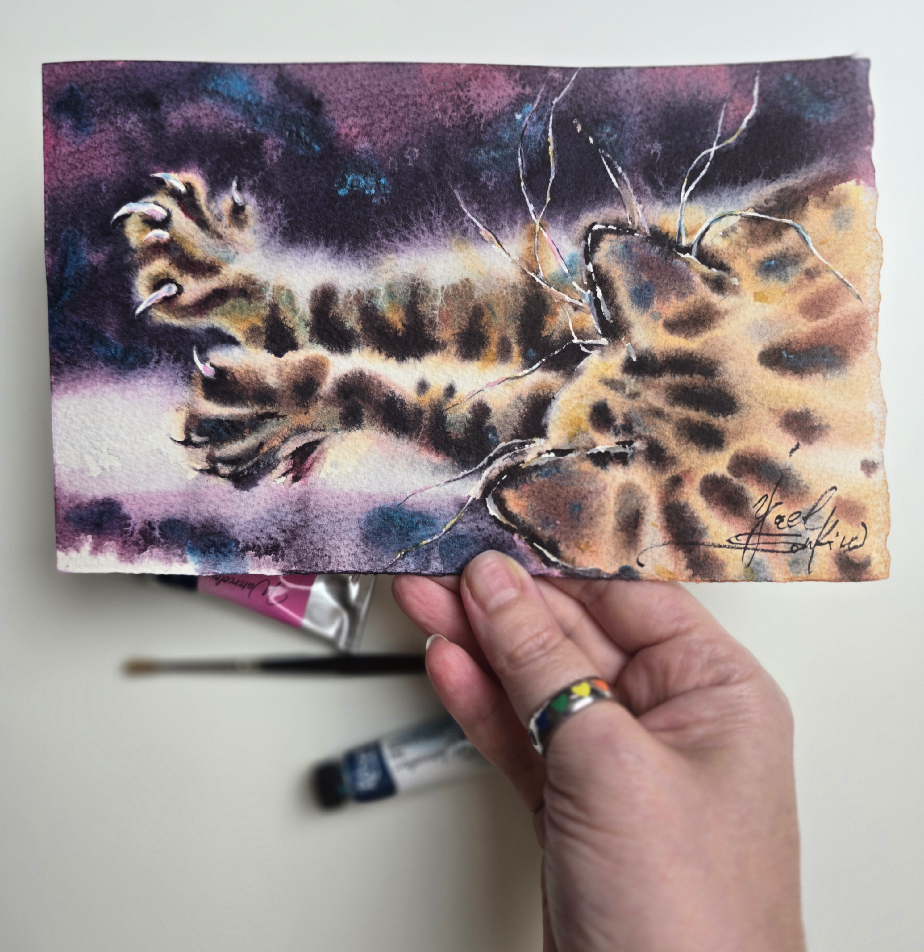 🖌️Loose watercolor washes and subtle color transitions create depth and softness, while expressive details of the paws and whiskers bring life and warmth to the composition. The slightly abstract background enhances the sense of motion and rest at the same time, making the scene feel intimate and peaceful.