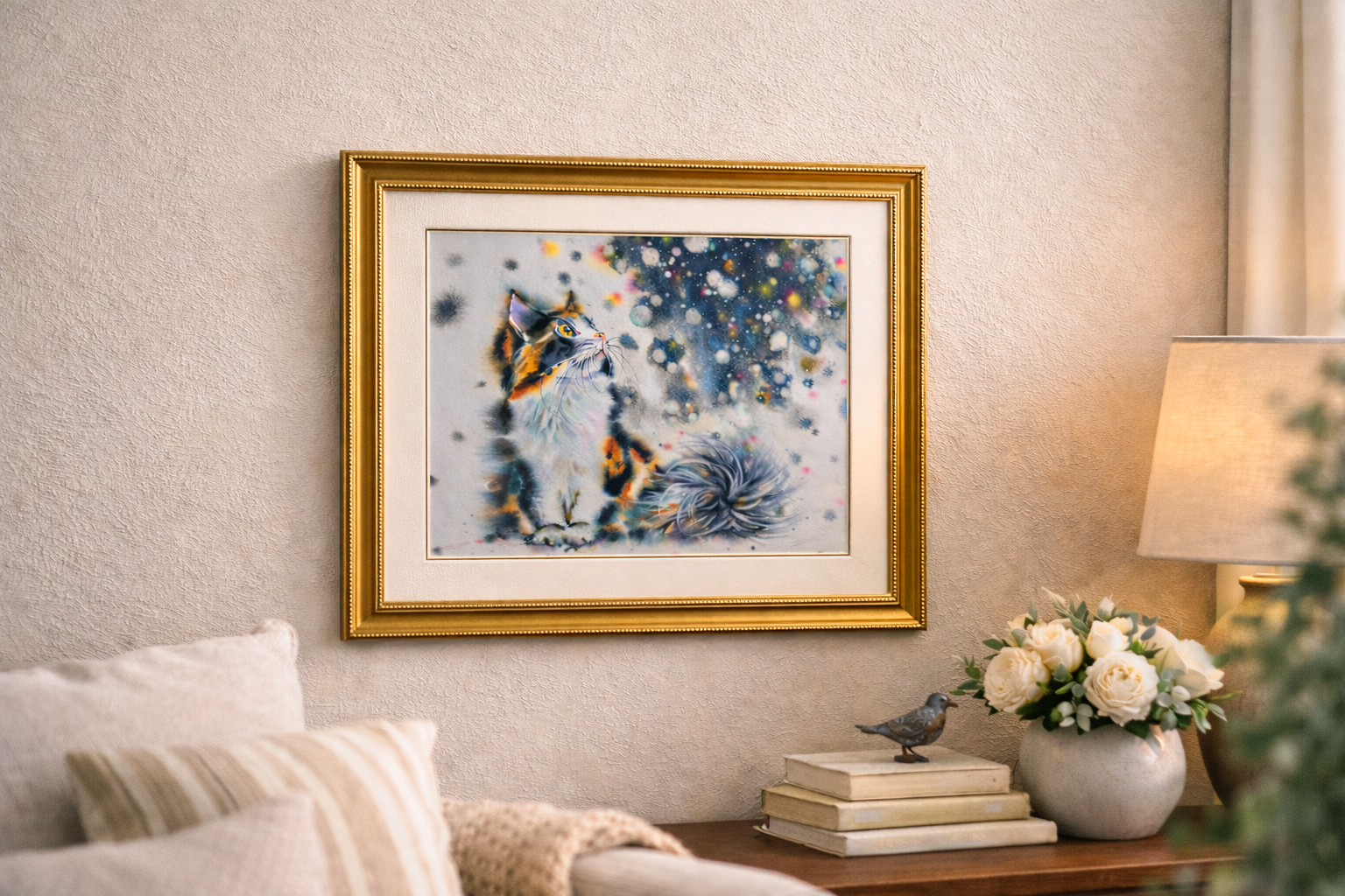 Calico Cat Watercolor Painting, Original Galaxy Starry Night Wall Art