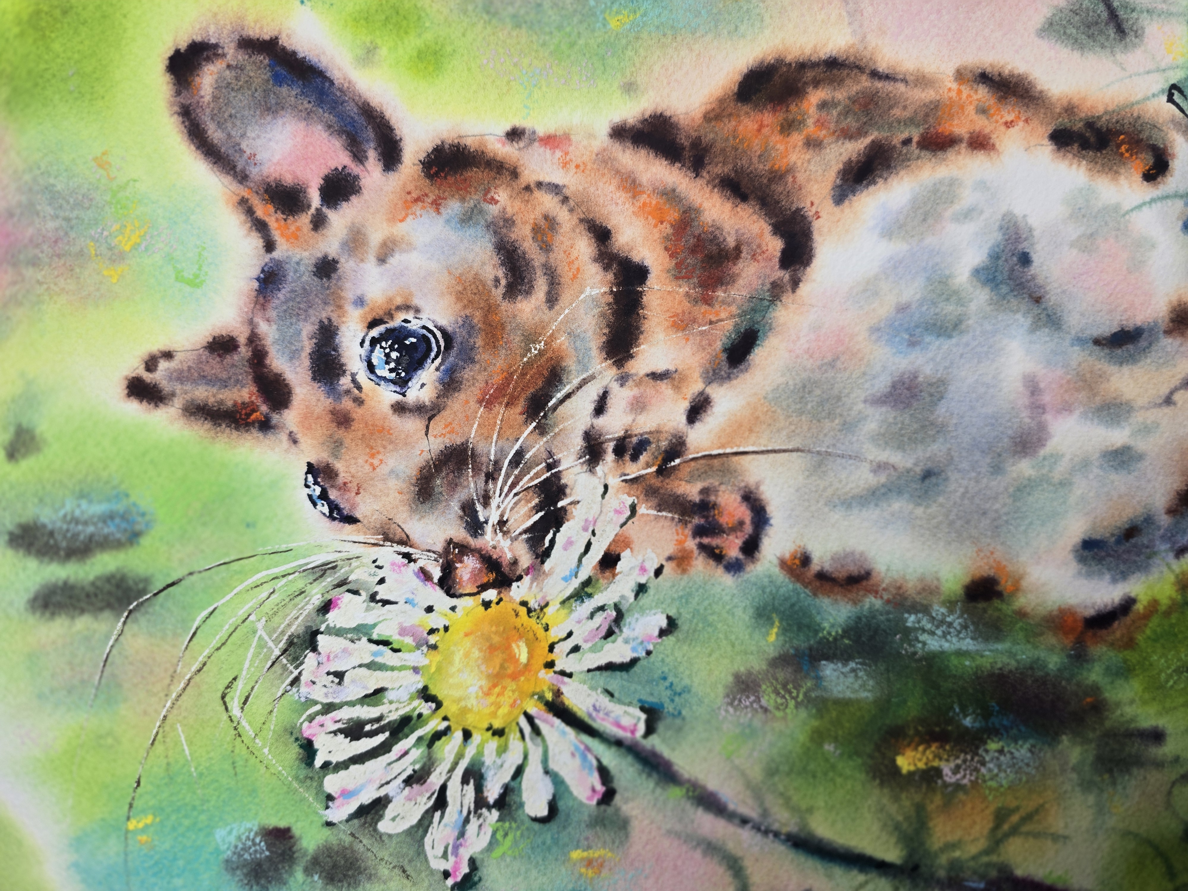 The delicate brushstrokes and vibrant colors create a joyful and heartwarming mood, making the artwork perfect for animal lovers.