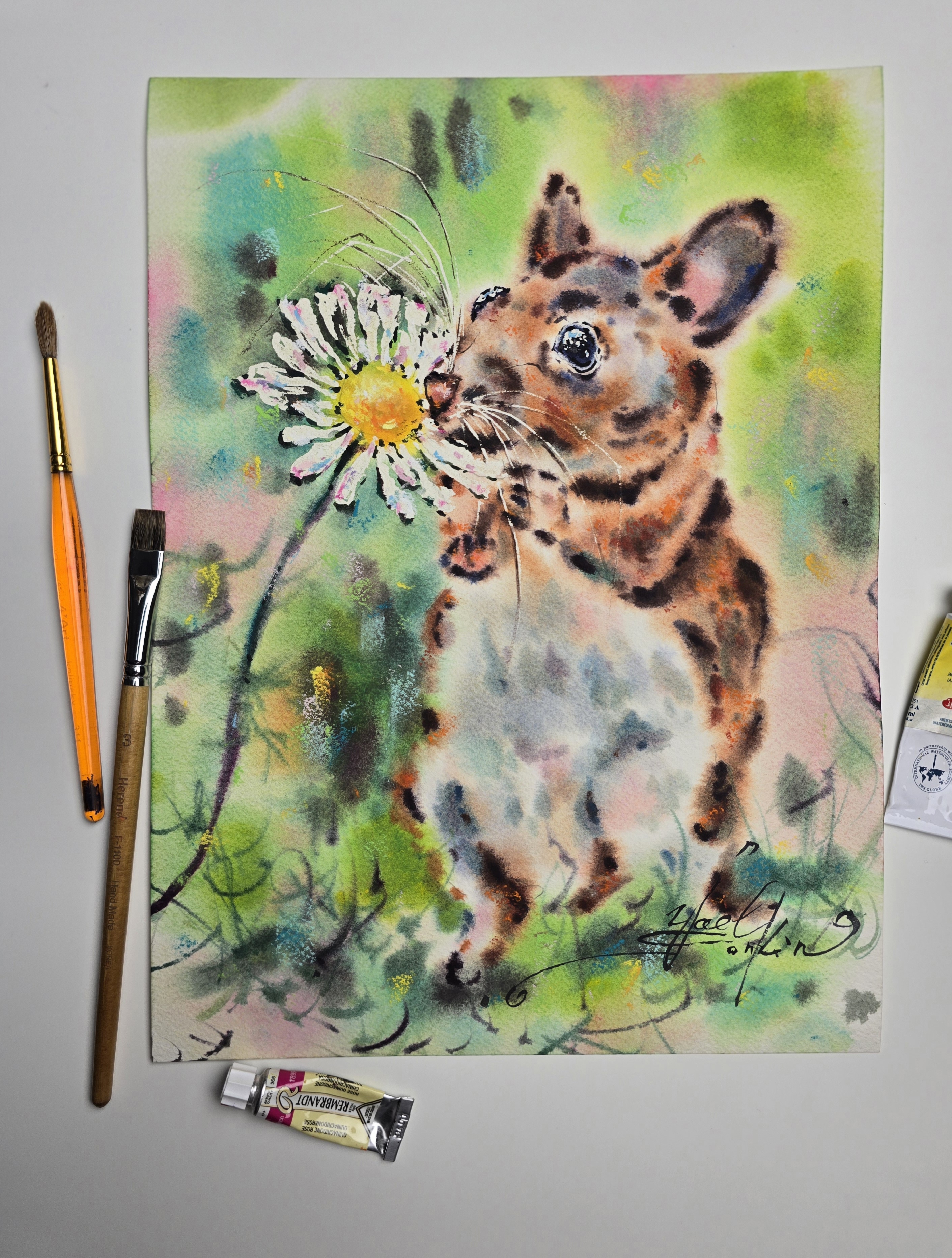 This original watercolor painting portrays an adorable hamster holding a daisy flower, painted with soft, bright tones that bring out the charm and playfulness of this little creature.