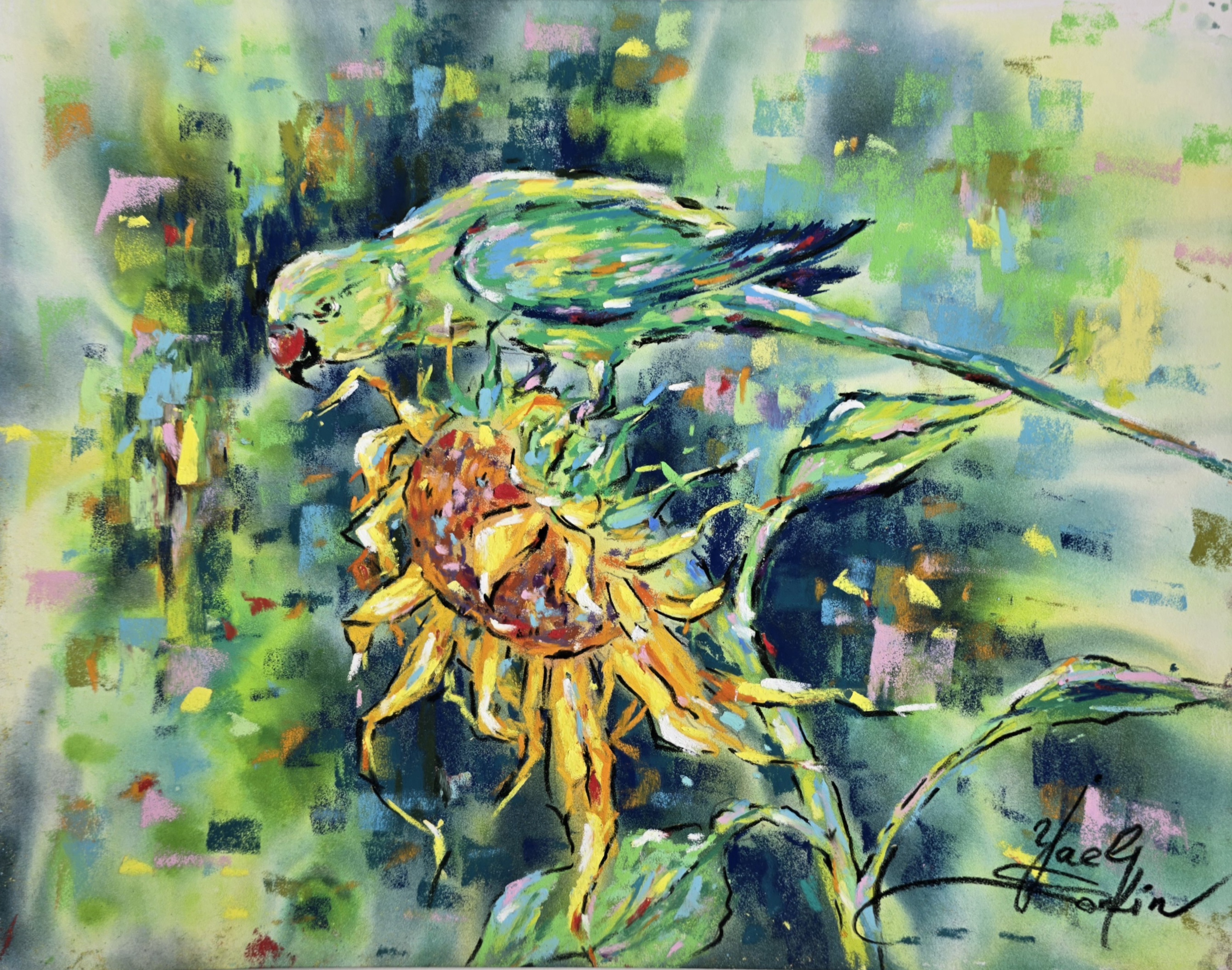 This original mixed media painting features a colorful parrot perched on a bright sunflower, created with watercolor and soft dry pastel.
