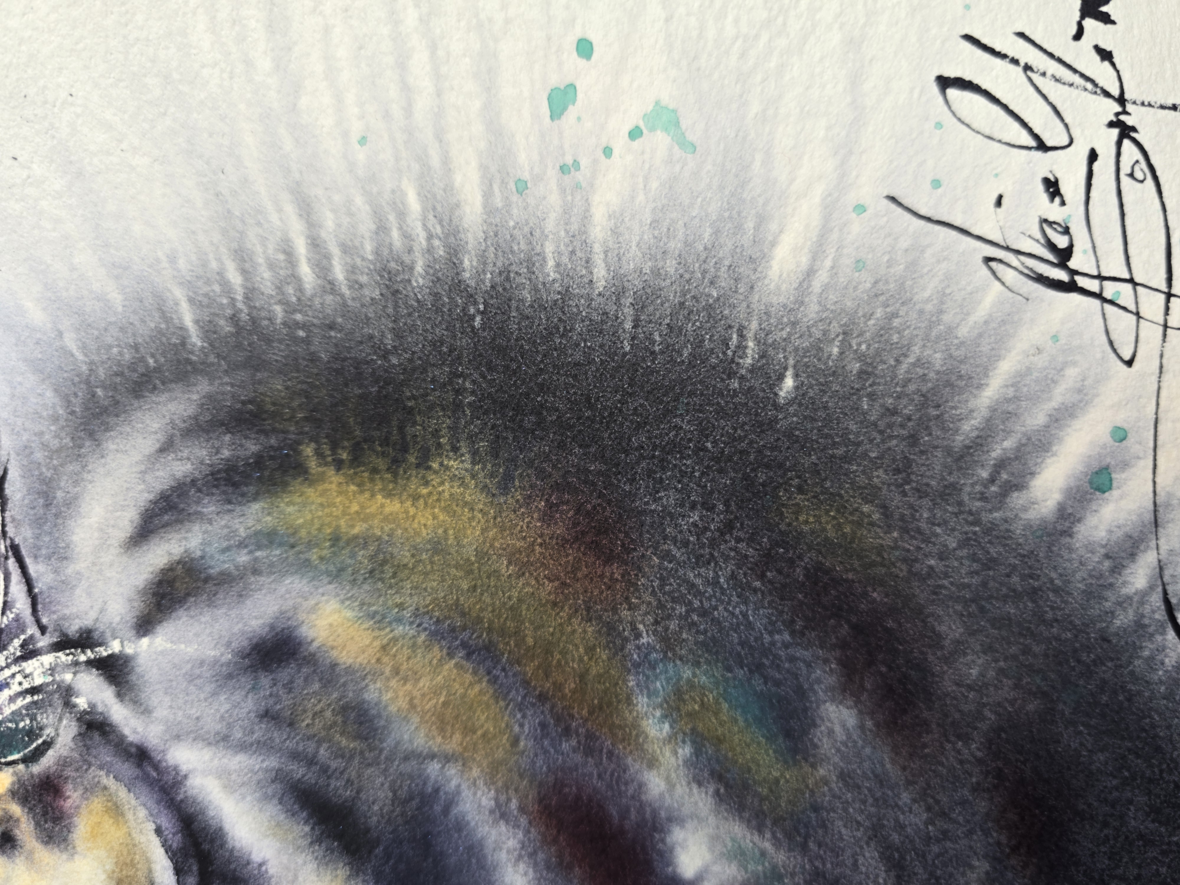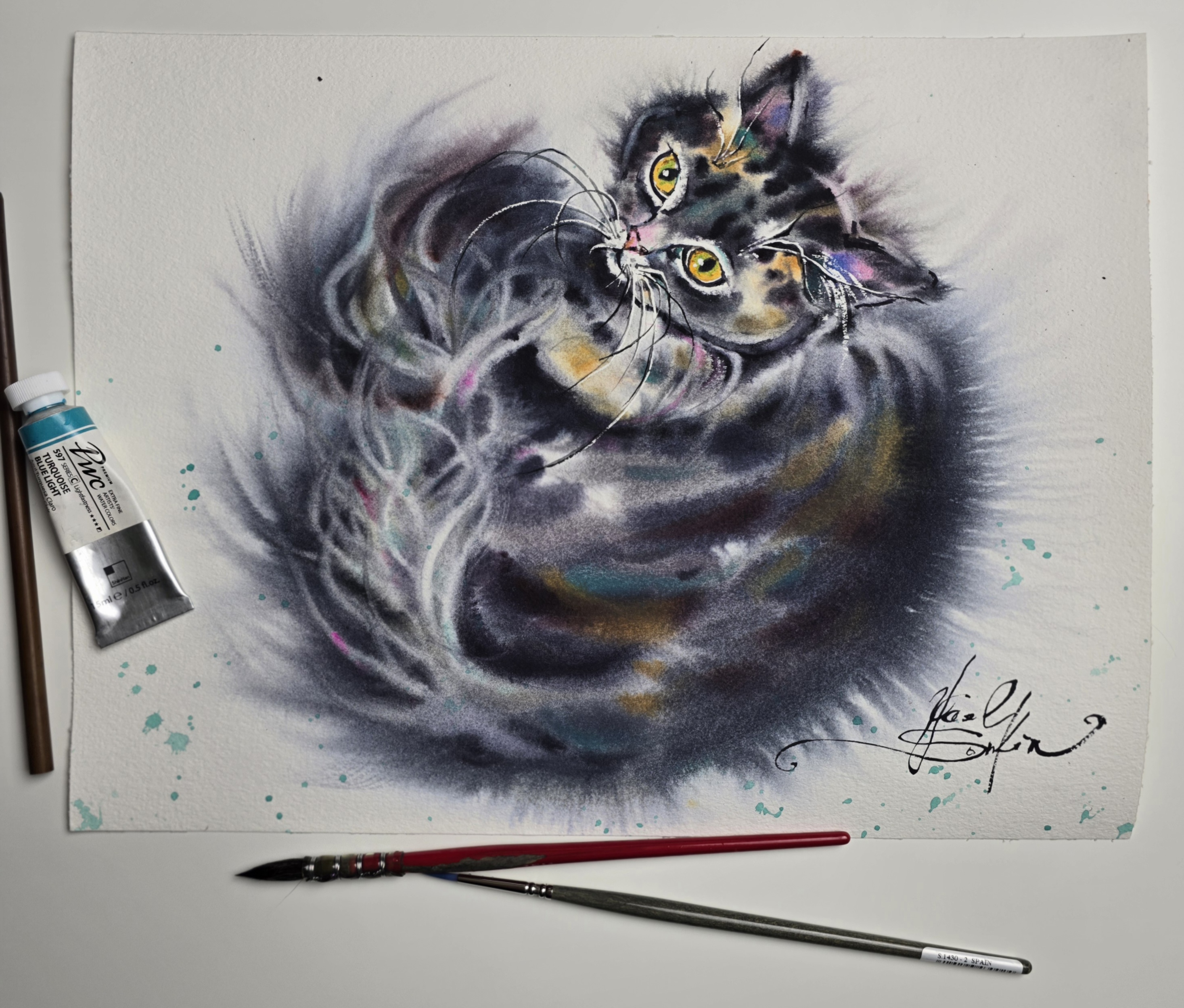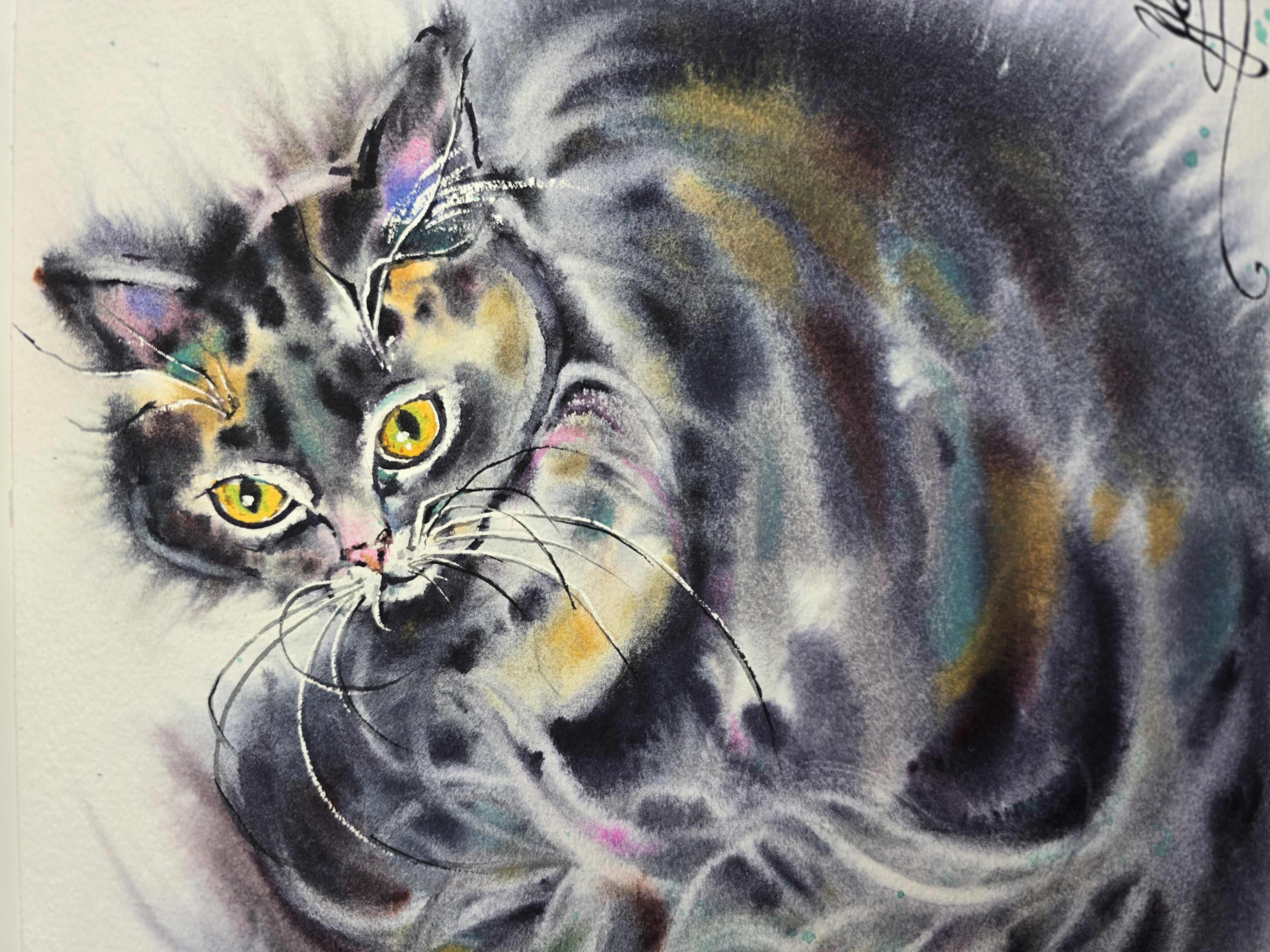 This original watercolor painting features a fluffy black cat with bright yellow eyes, painted with soft washes and dynamic brushstrokes.