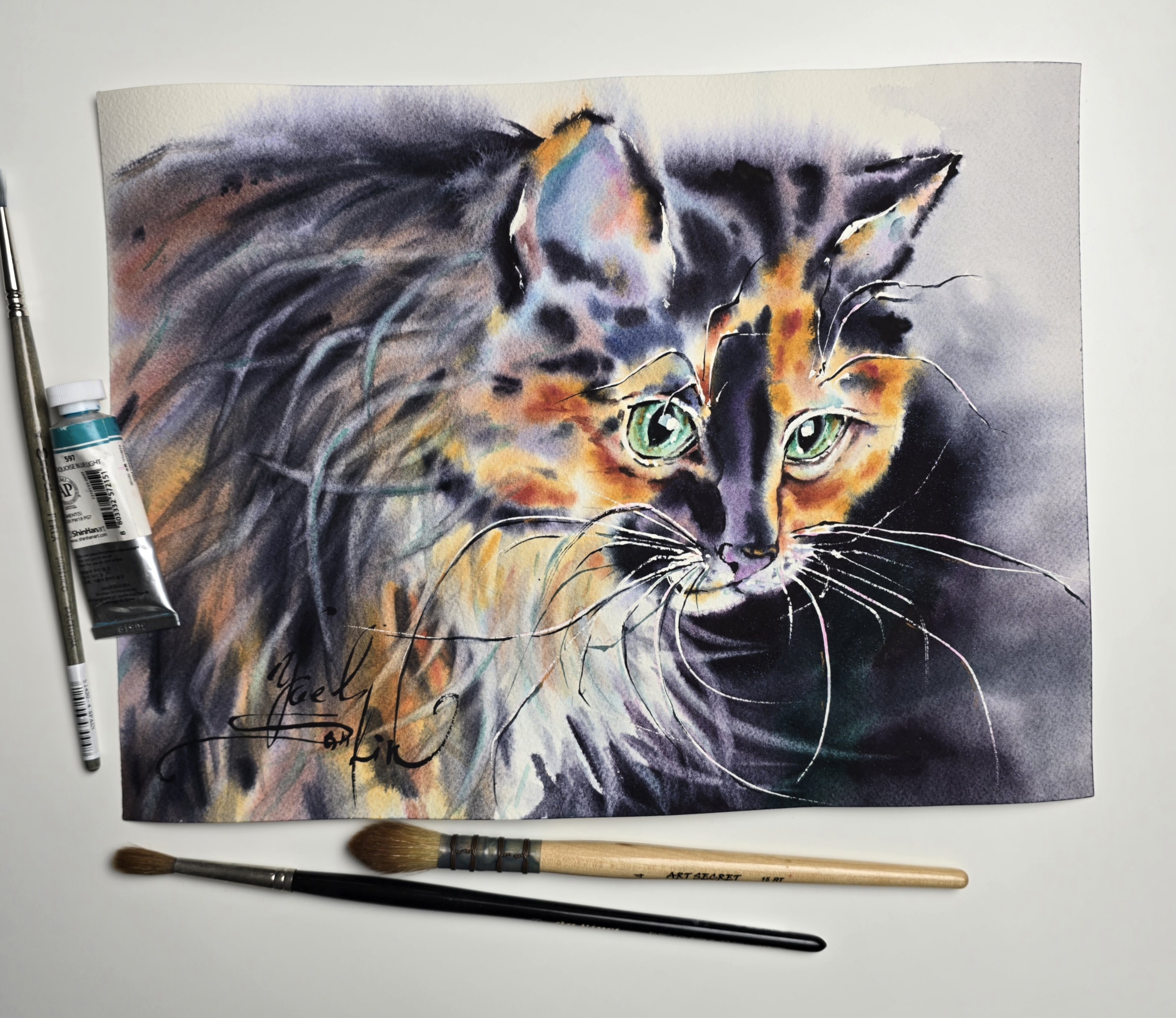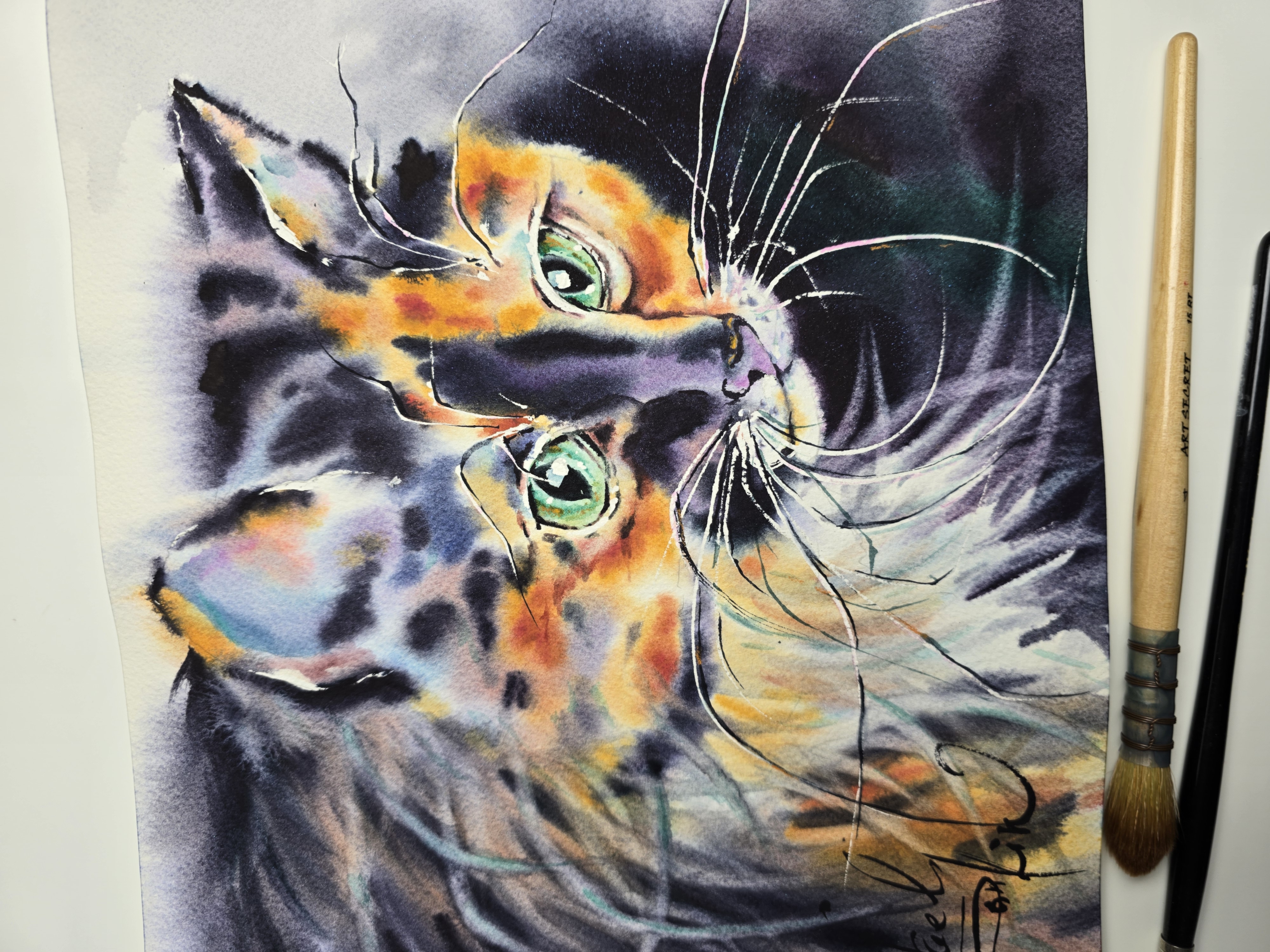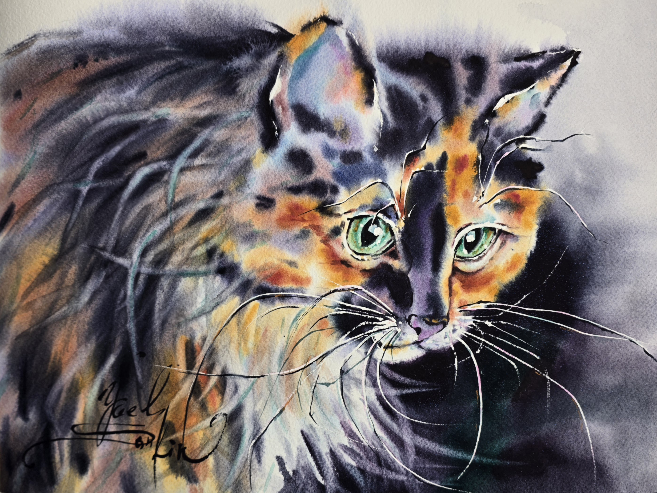 This original watercolor painting features a beautiful black and orange cat with striking green eyes and flowing fluffy fur.