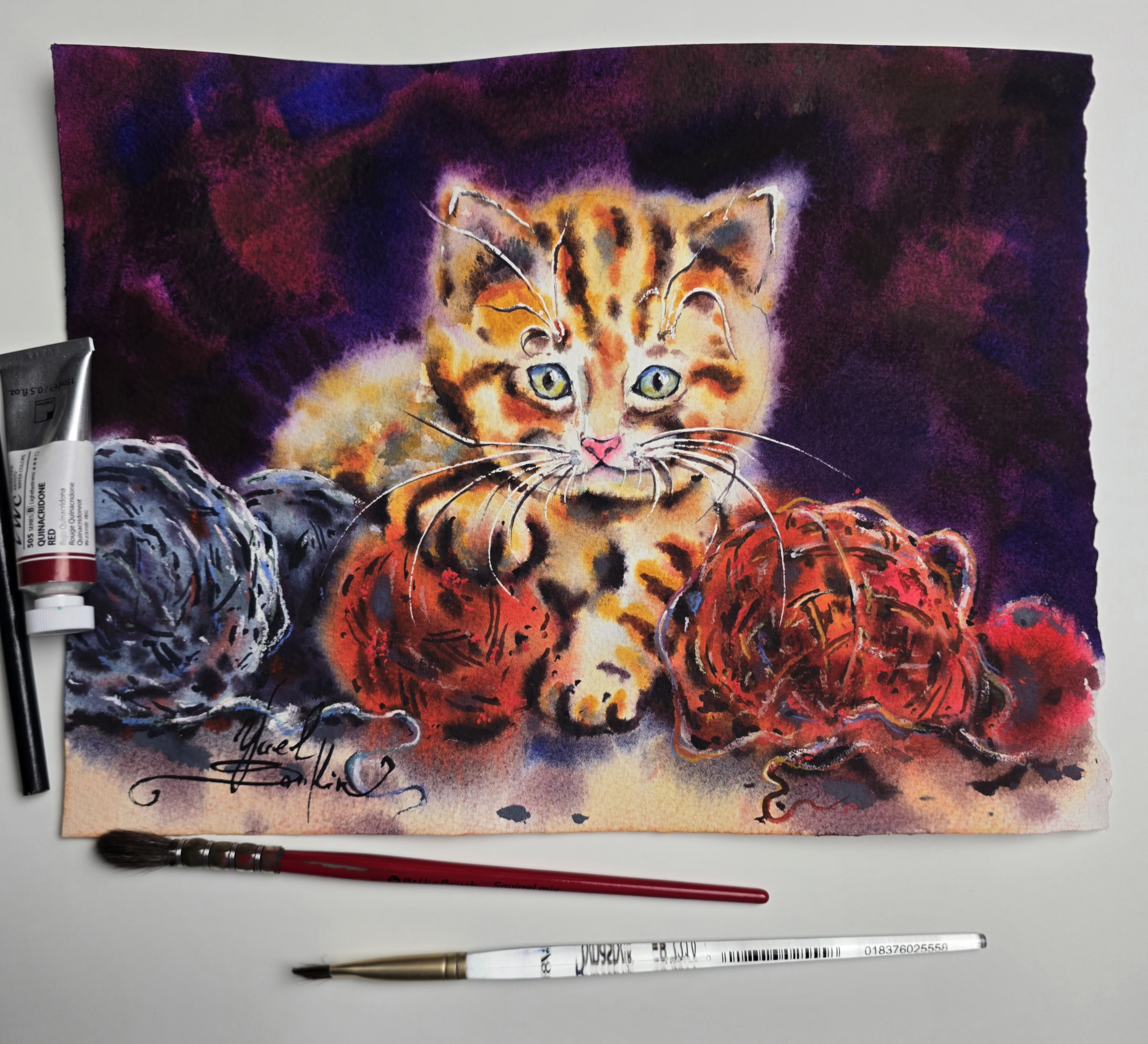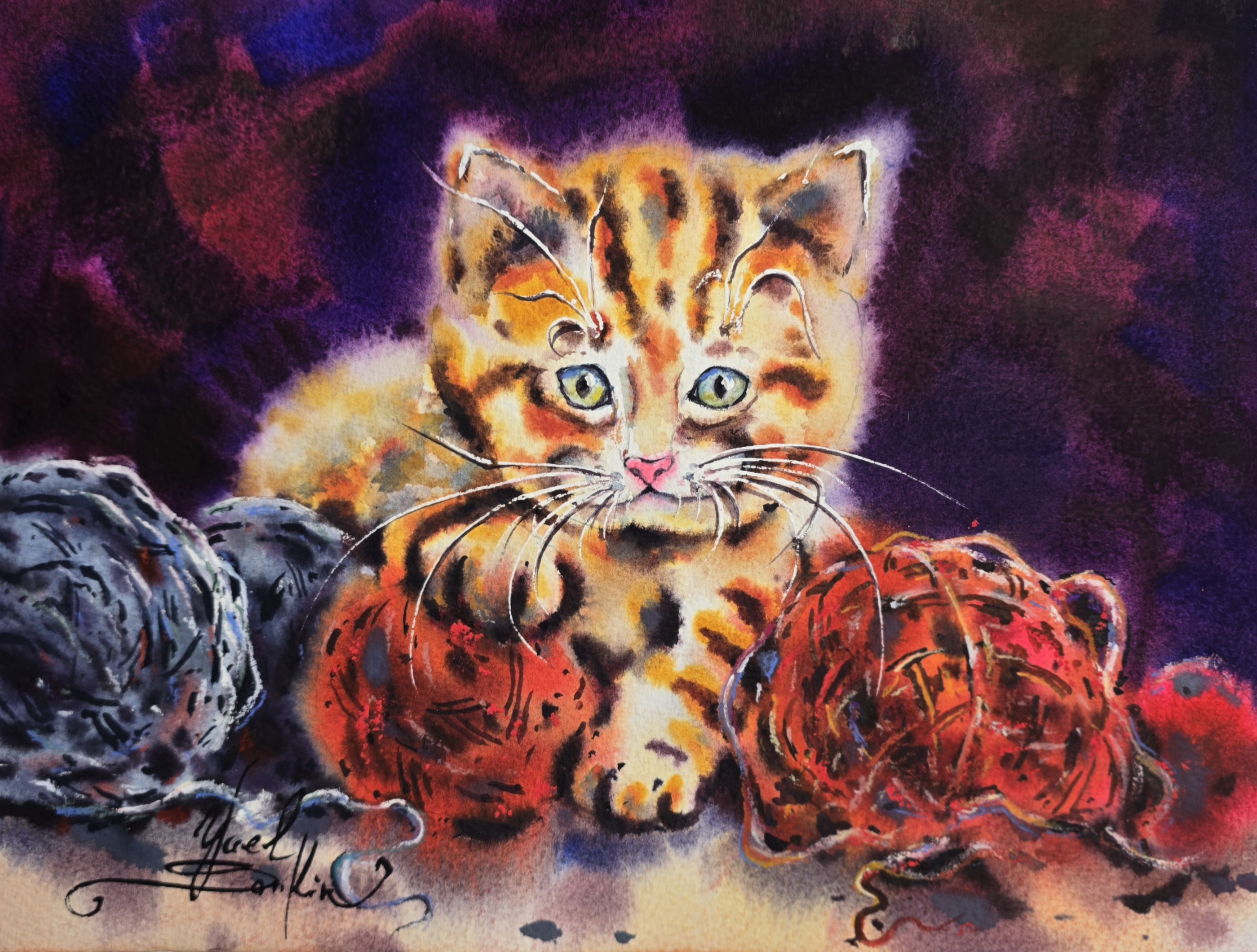 Add warmth and playfulness to your home with this original watercolor painting of a kitten with yarn balls.
