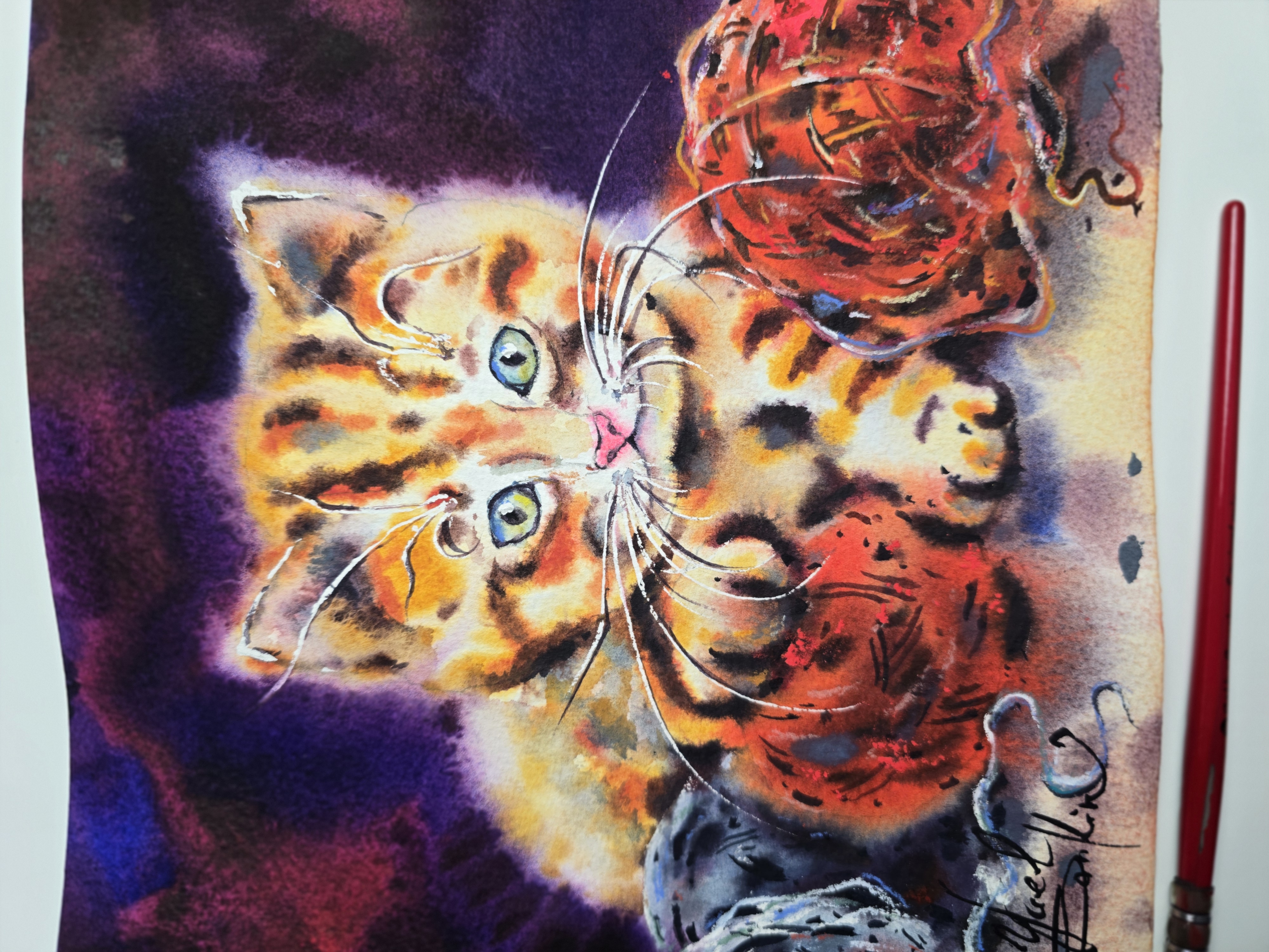 Painted in rich colors with expressive brushstrokes, the artwork captures the curious charm of a little cat surrounded by red and gray threads of wool.