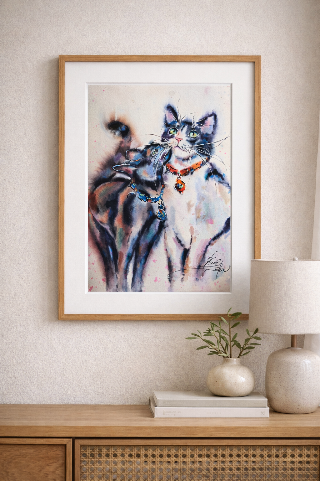 Cat Watercolor Painting Original Two Cats Pet Portrait Wall Art