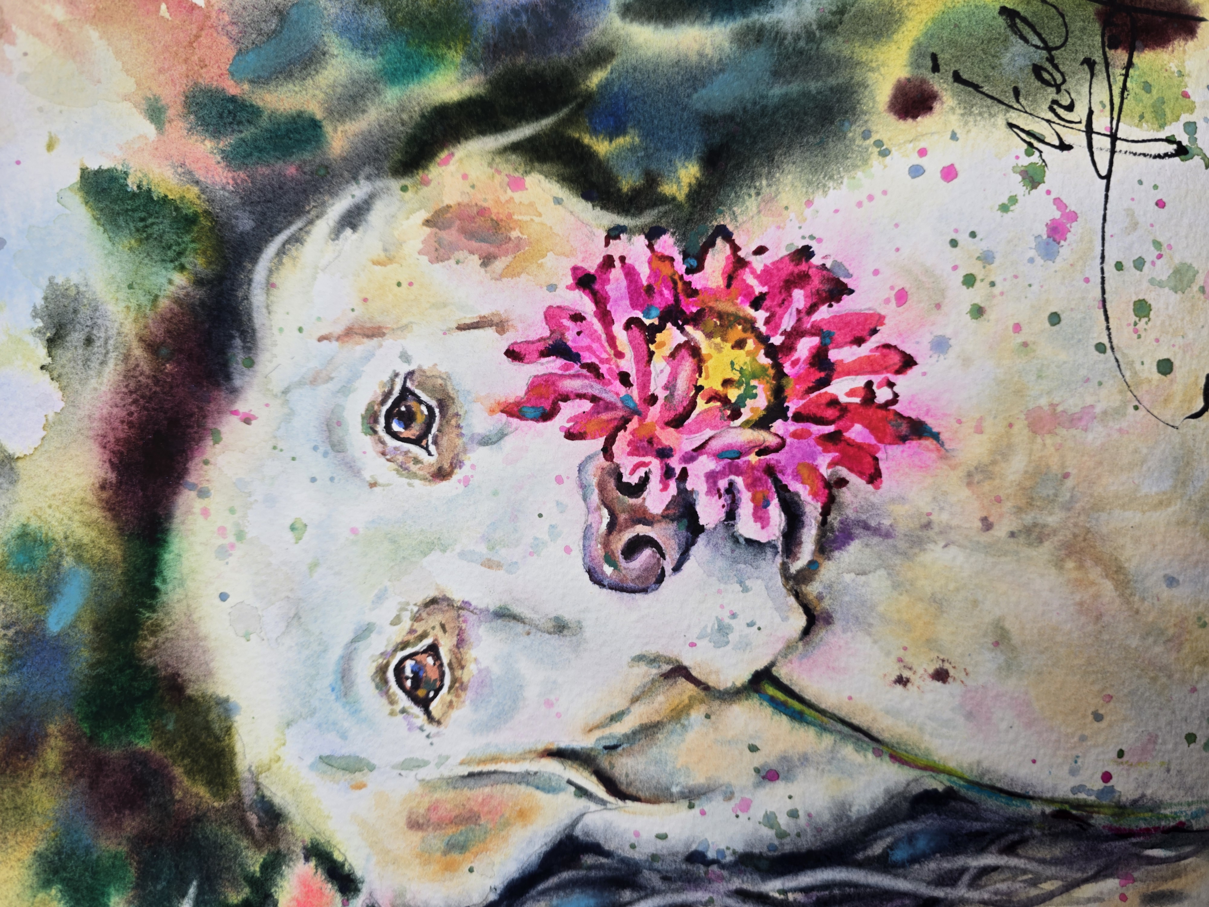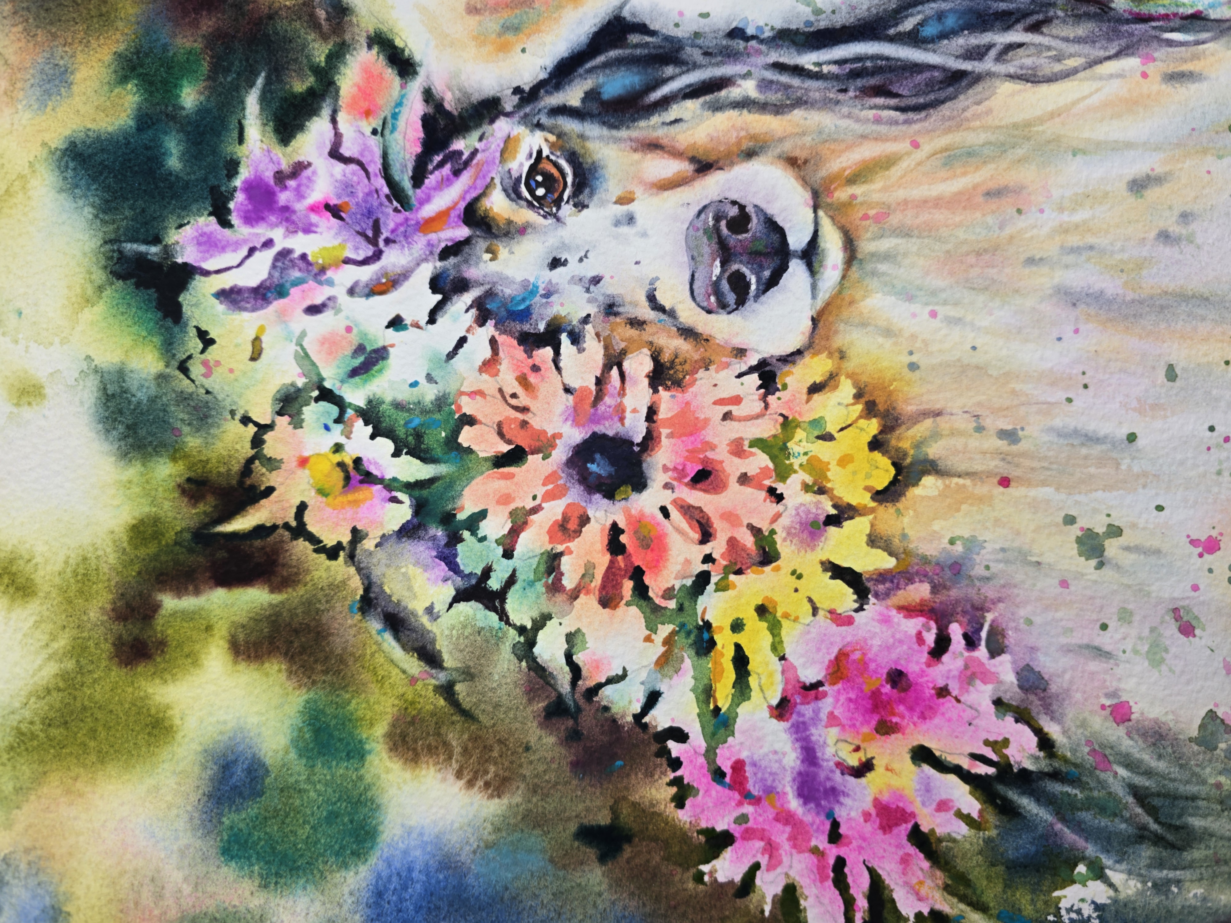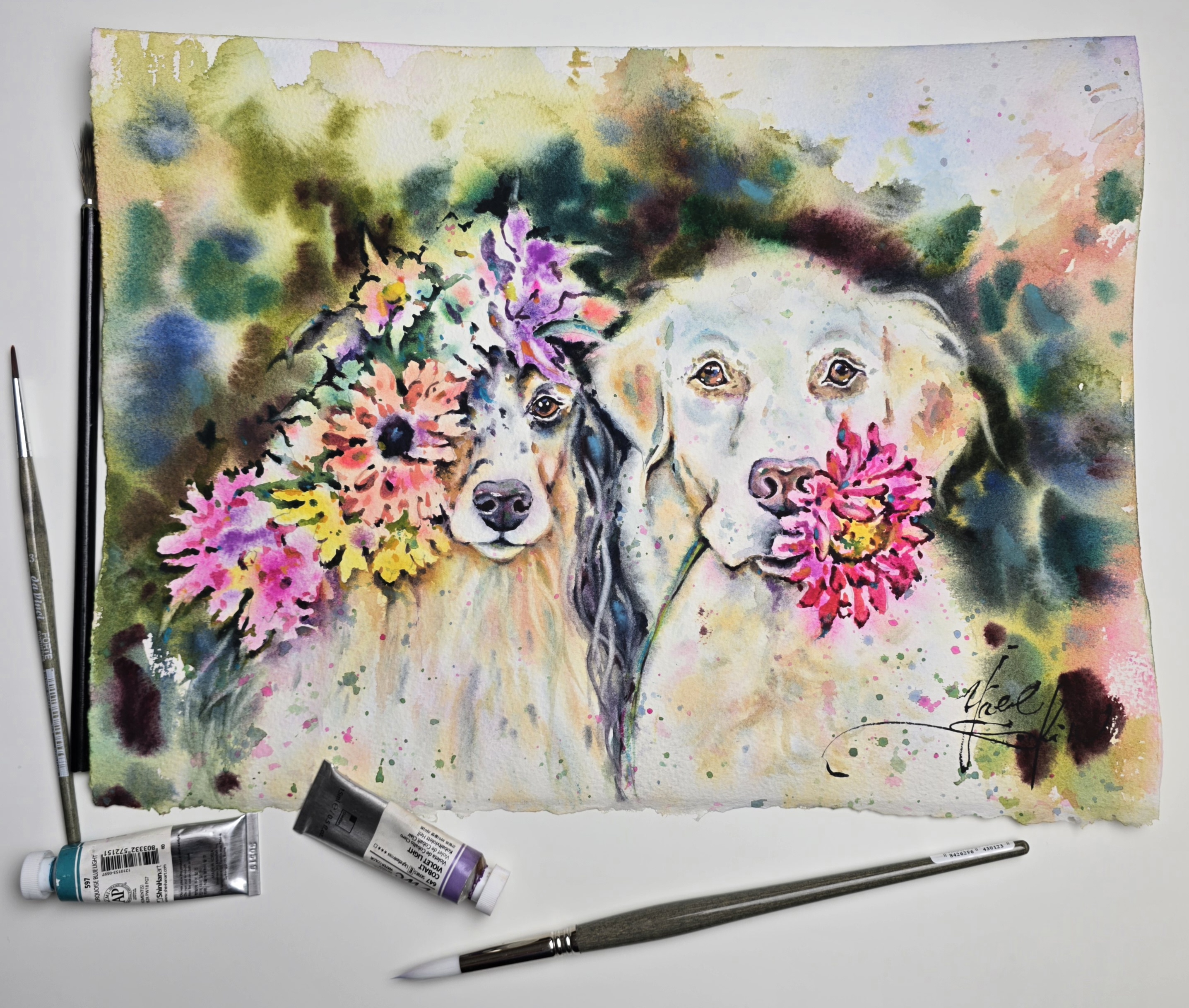 🎨Bright and cheerful watercolor of two dogs with colorful flowers.