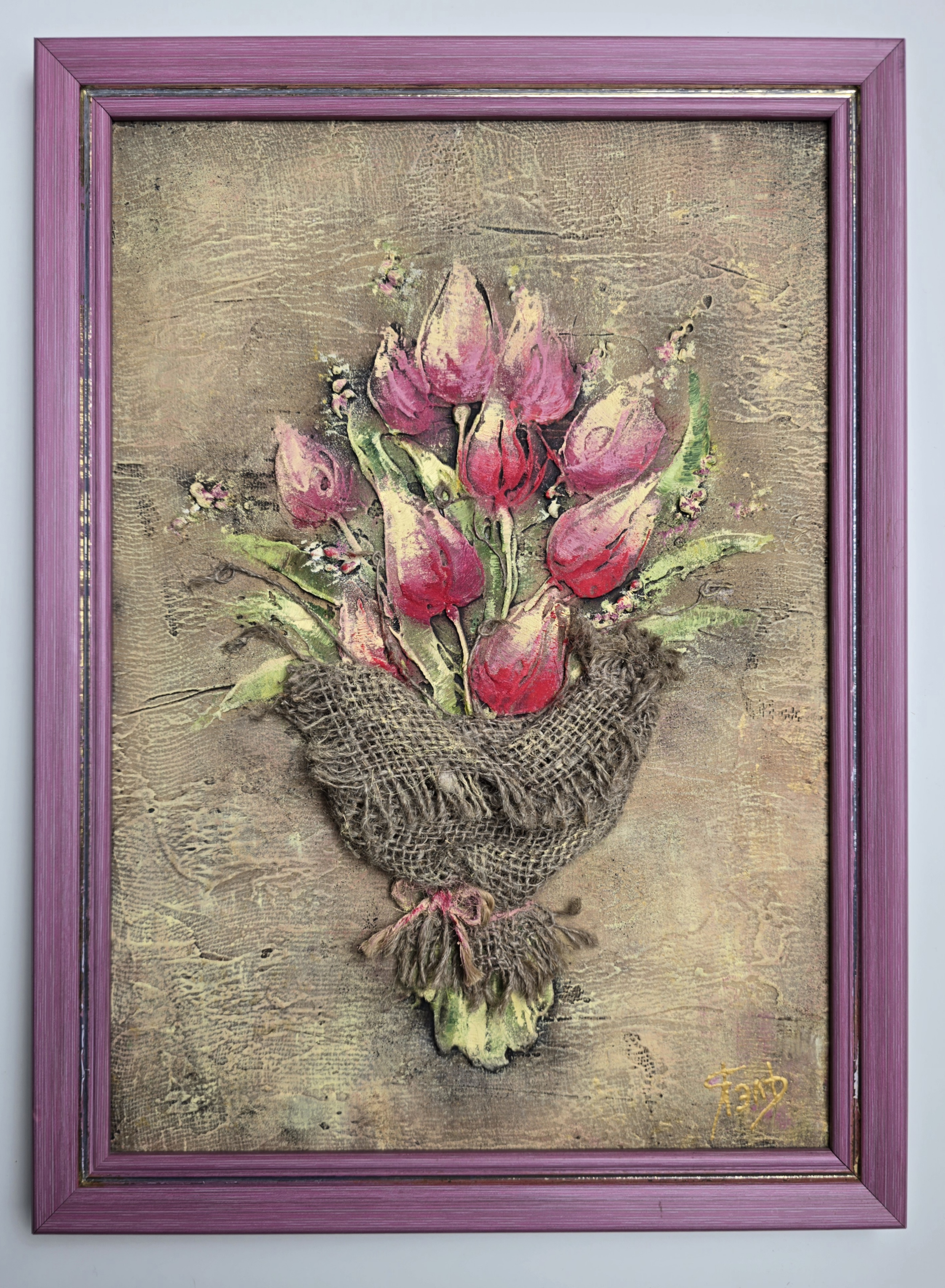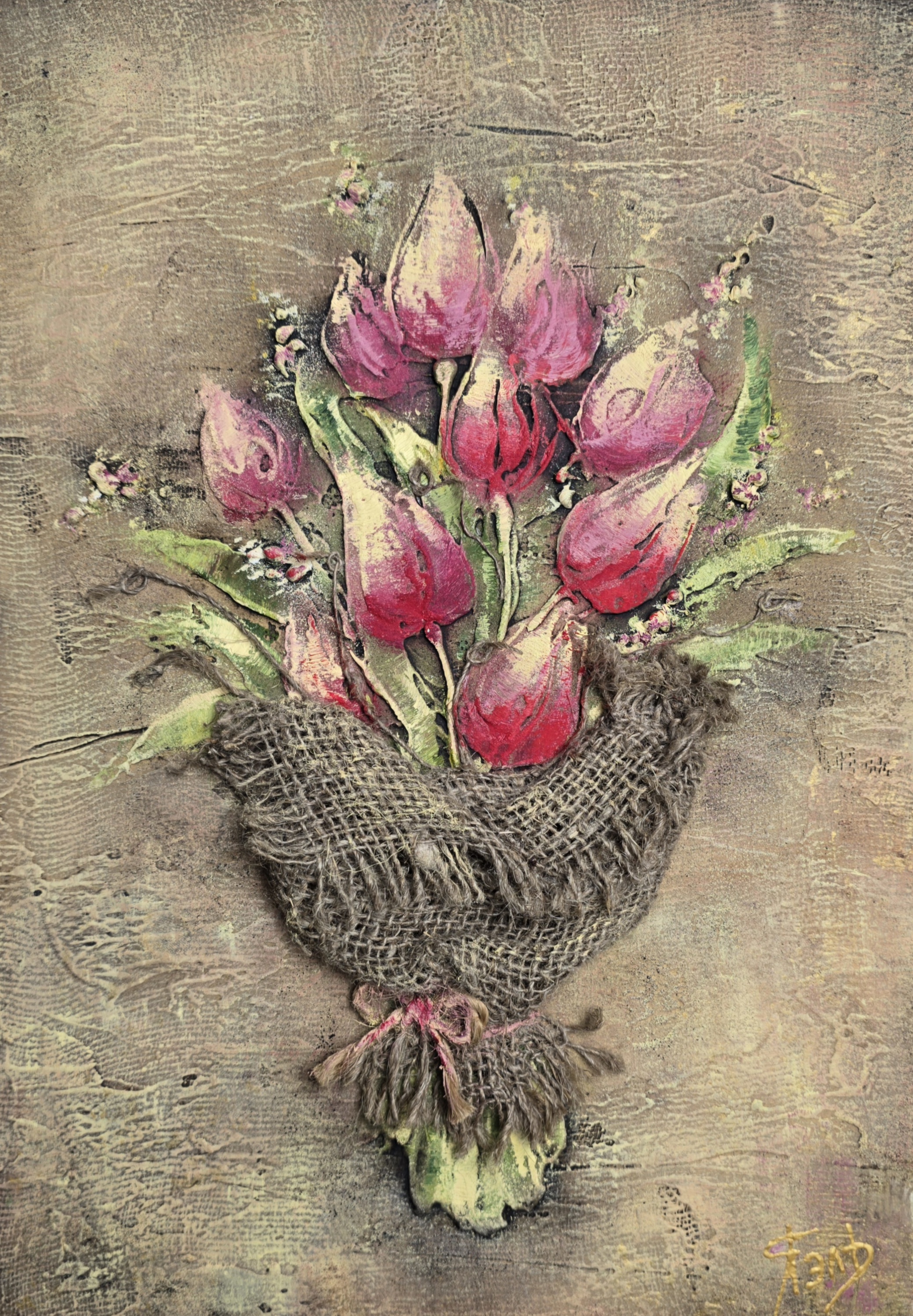 The composition shows a bouquet of tulips wrapped in rustic burlap – a symbol of tenderness, warmth, and timeless beauty. The textured background, combined with the vibrant oil colors, makes this work both elegant and expressive, perfect for enhancing any interior space.