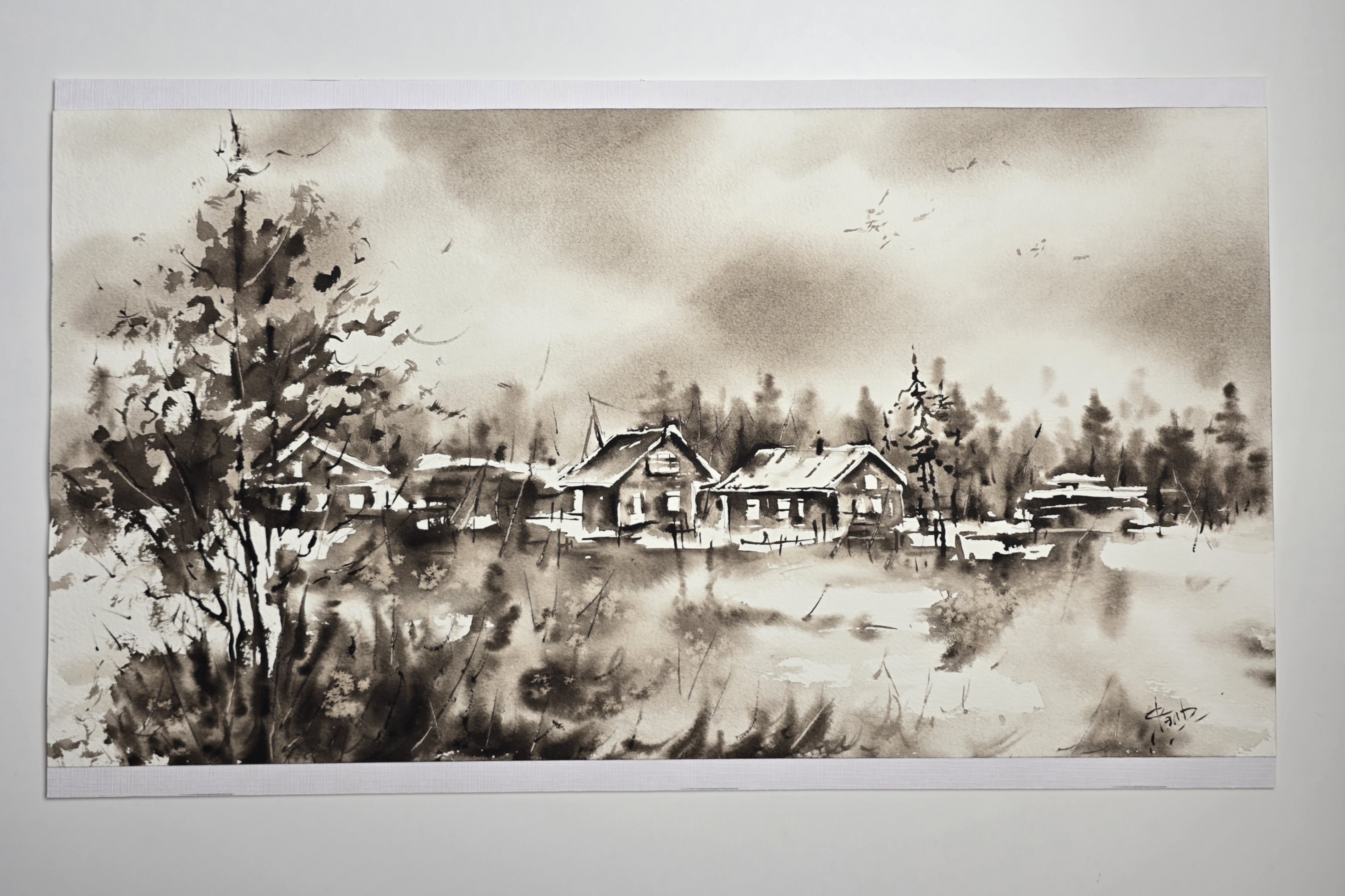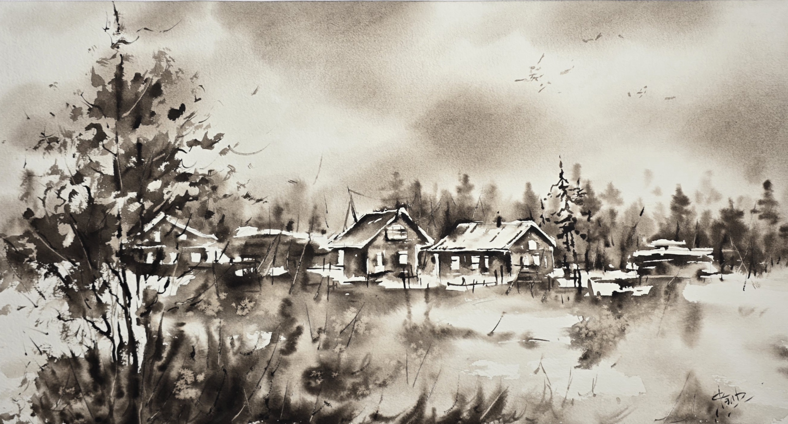 This monochrome watercolor landscape depicts a peaceful rural village in the heart of winter.