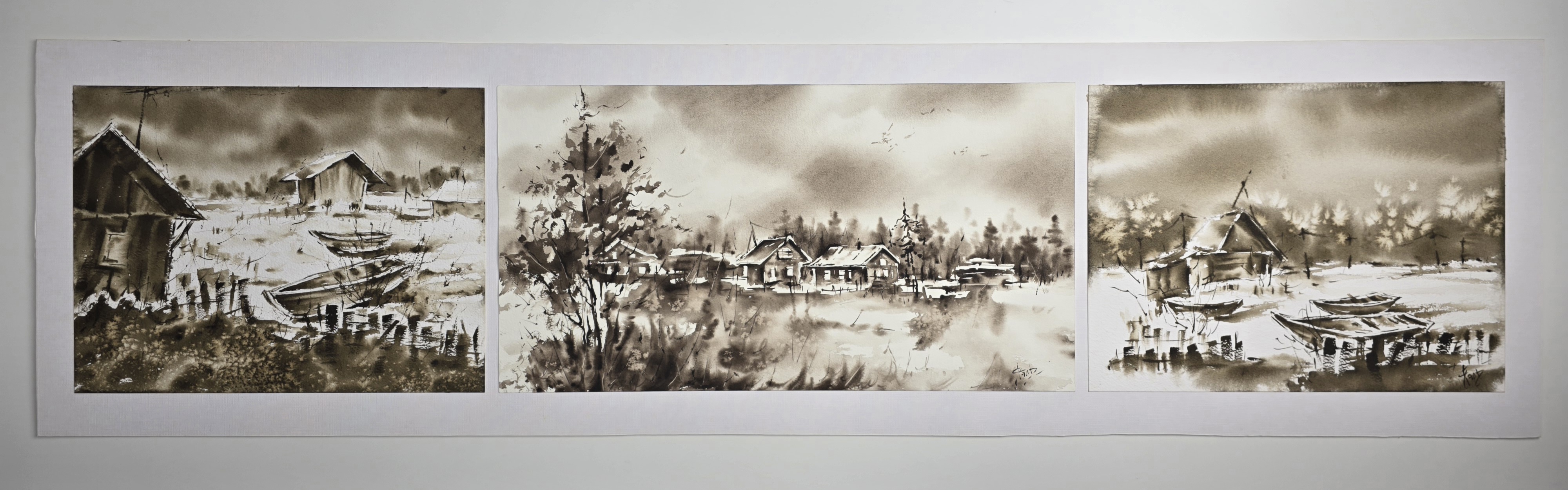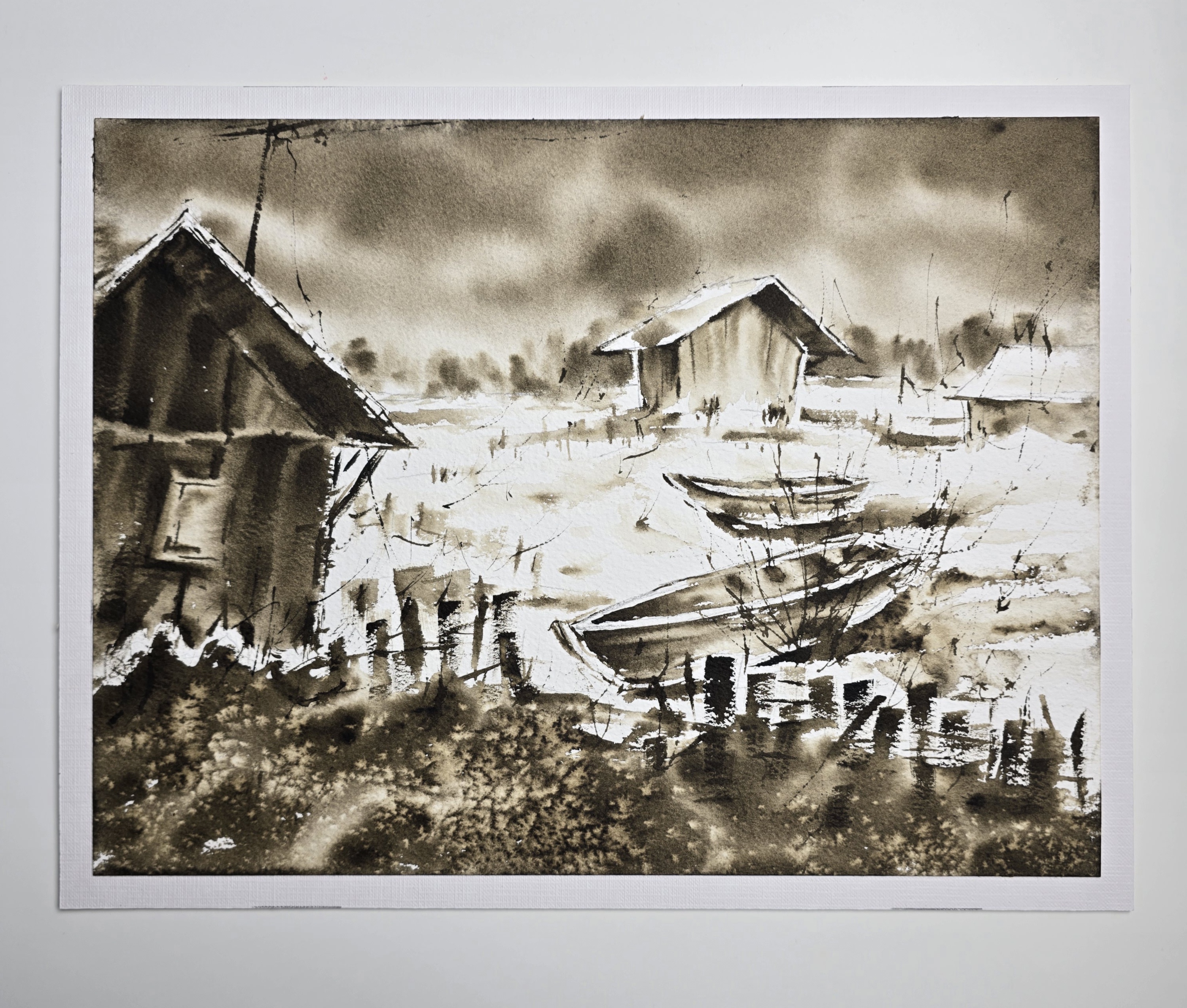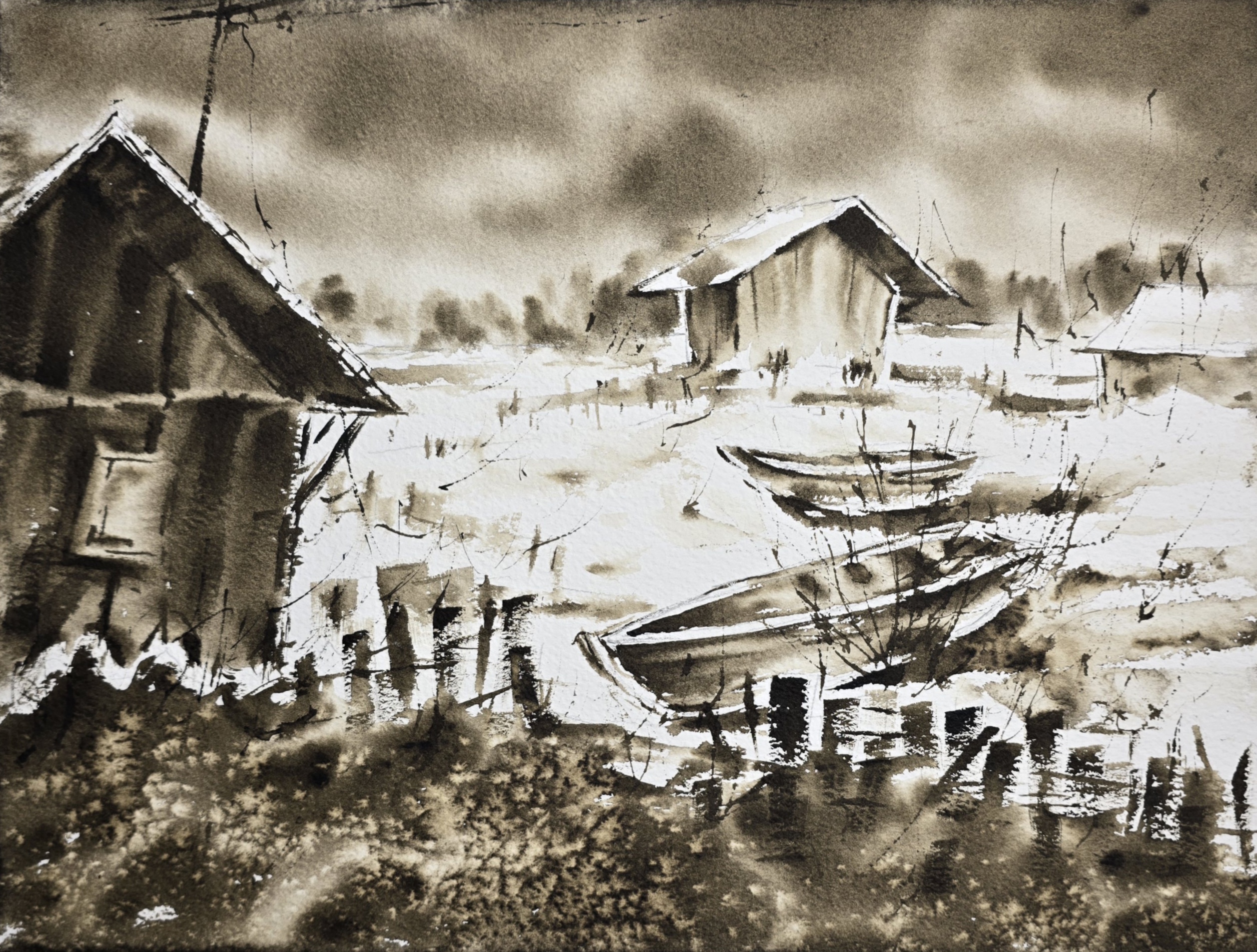This sepia monochrome watercolor portrays a small winter village by the water, where wooden boats rest silently on the snowy shore.