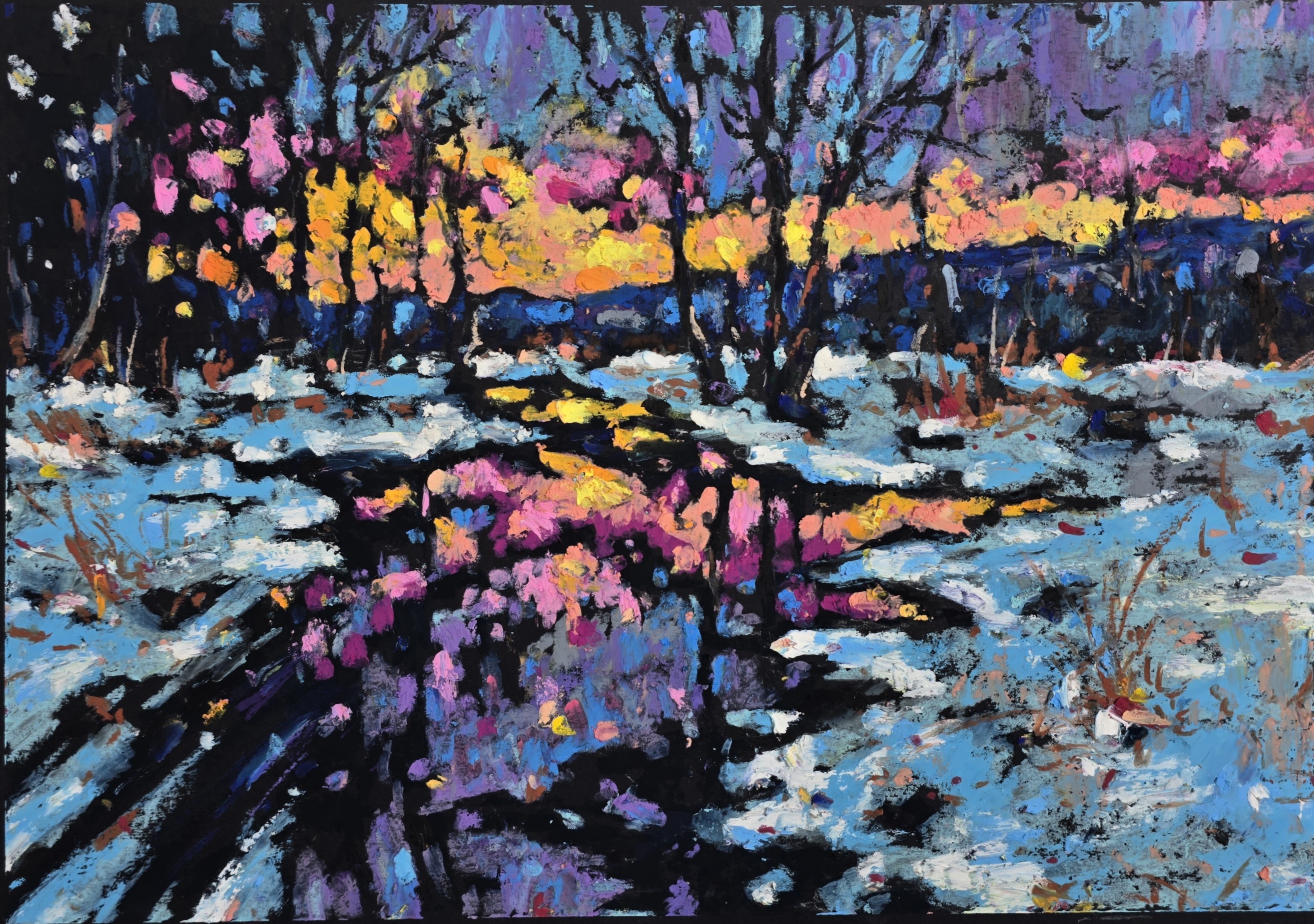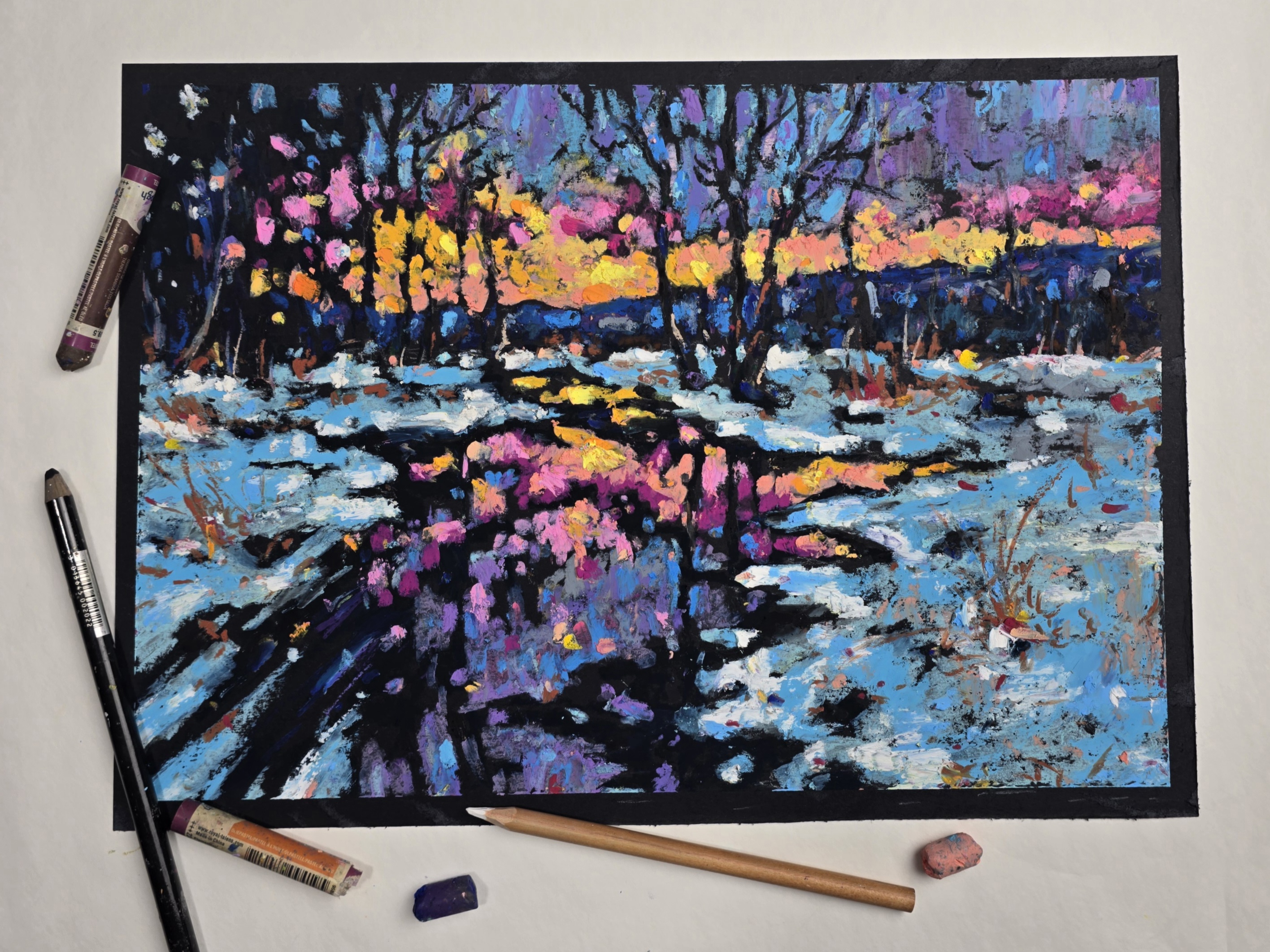 🎨"Radiance of Winter Sunset" is an original oil pastel painting that captures the magic of a snowy landscape glowing under a vibrant sunset. Bright shades of pink, yellow, blue, and violet reflect in the melting snow and water, creating a dynamic and expressive composition. The piece highlights the beauty of nature’s contrasts – the cold of winter and the warmth of evening light.