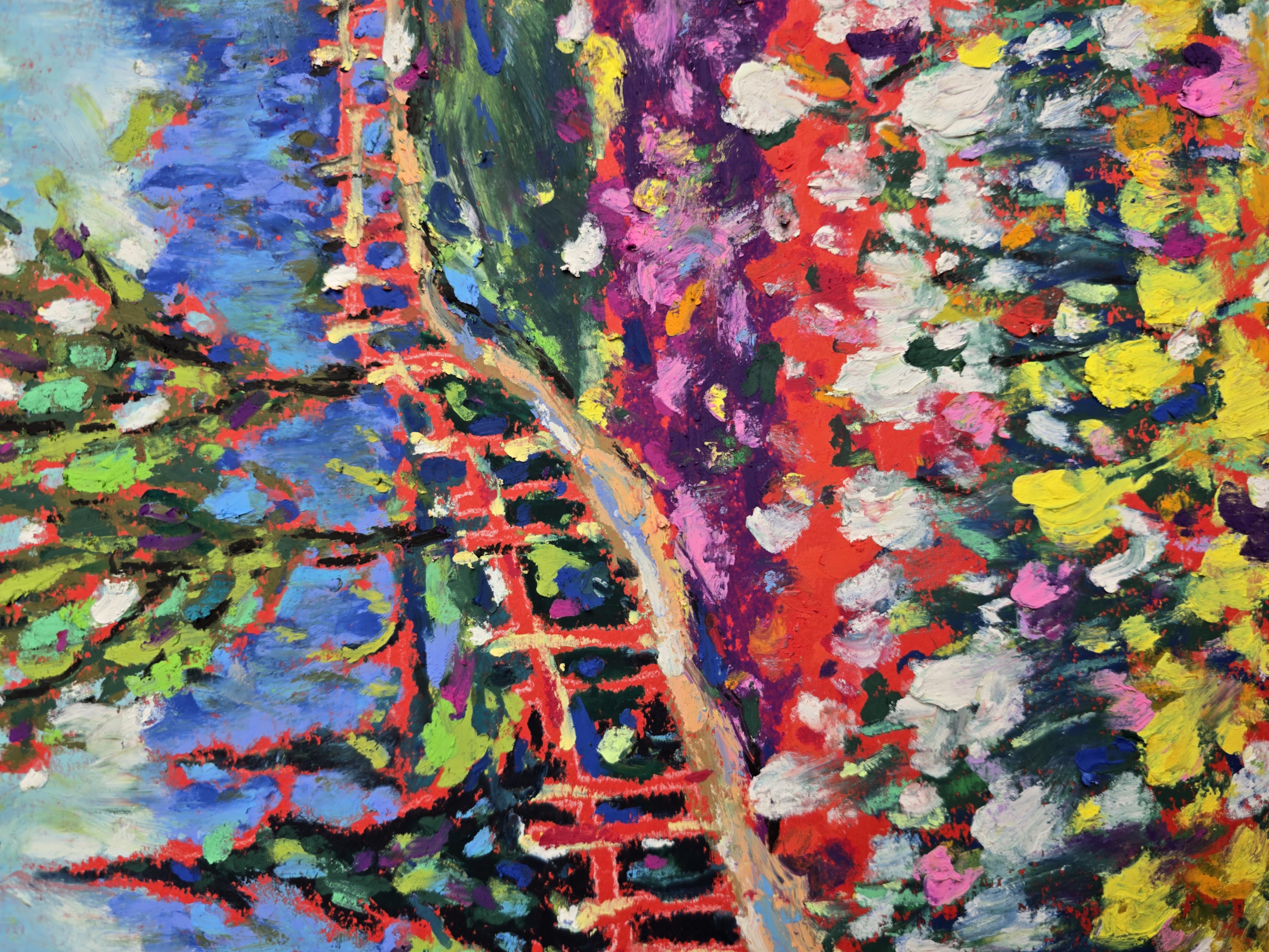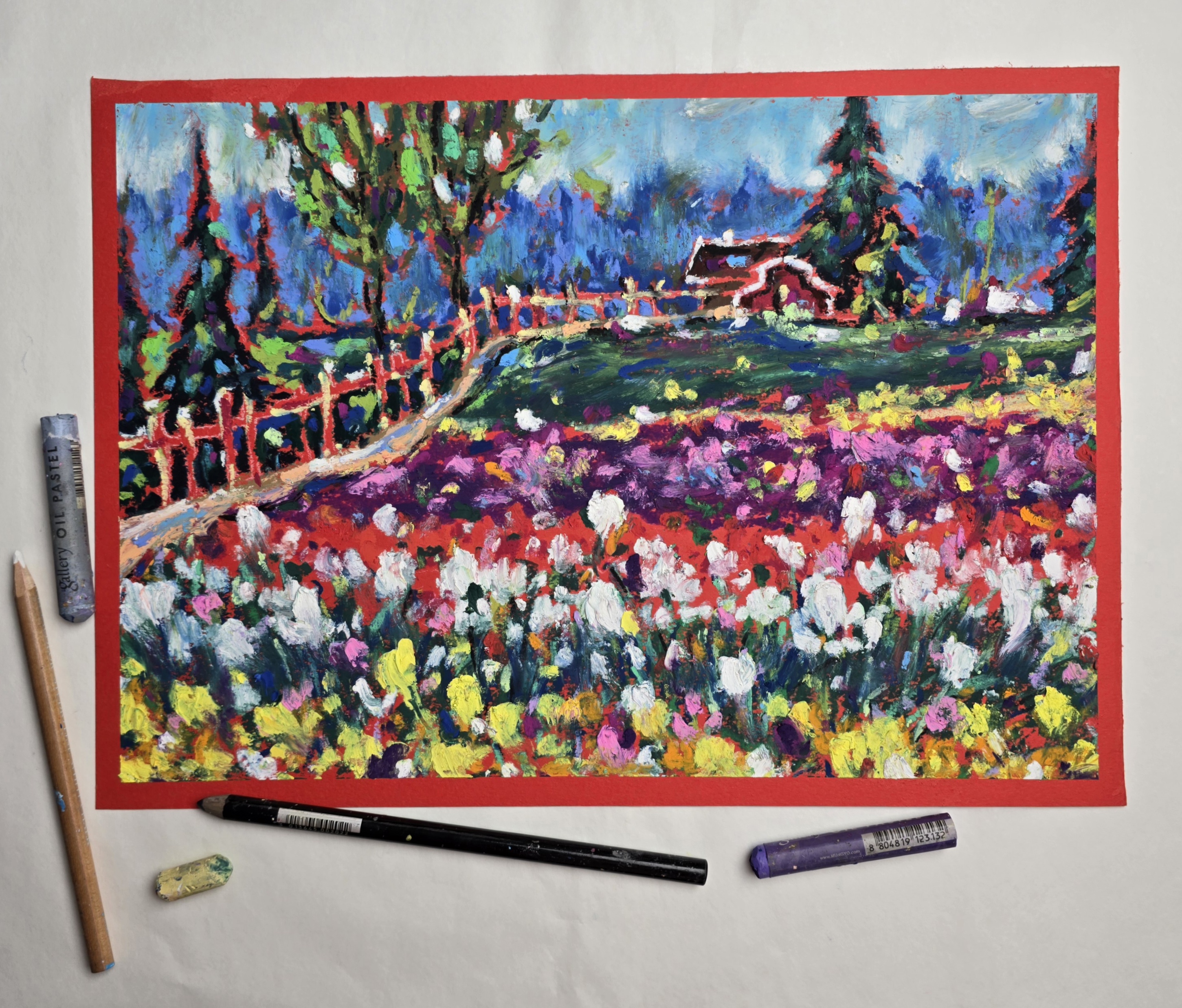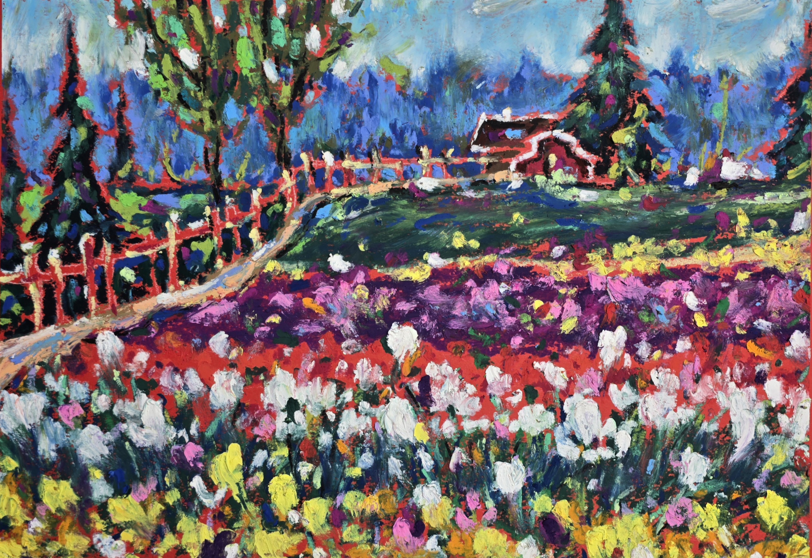 🎨"Colors of Skagit Valley" is an original oil pastel painting inspired by the world-famous Skagit Valley Tulip Festival in Washington State. This expressive work captures the vibrancy of blooming tulip fields, the rustic charm of a countryside fence, and the distant silhouette of a wooden house framed by evergreen trees. The bright palette of reds, pinks, yellows, and greens conveys the joyful energy of spring in full bloom.