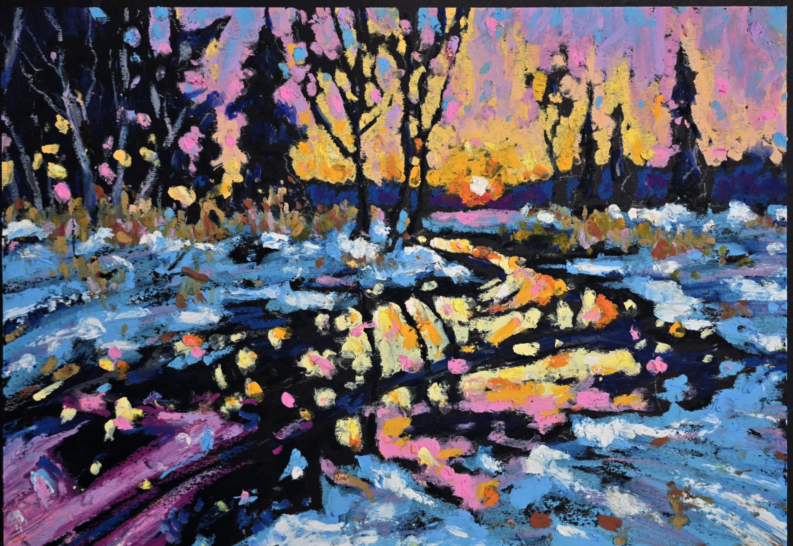 Winter Sunset Reflections - Original Winter Landscape Oil Pastel Wall Art