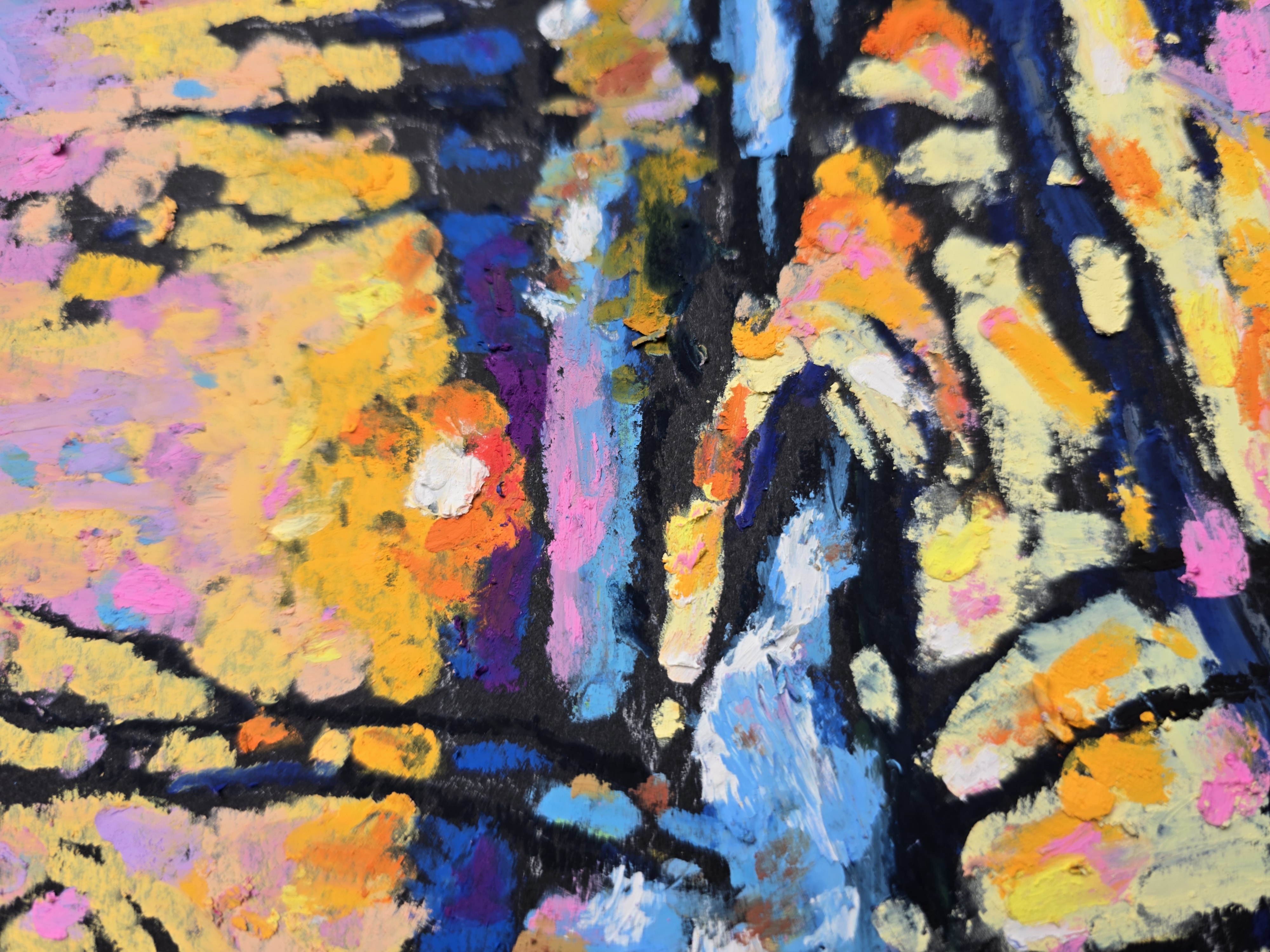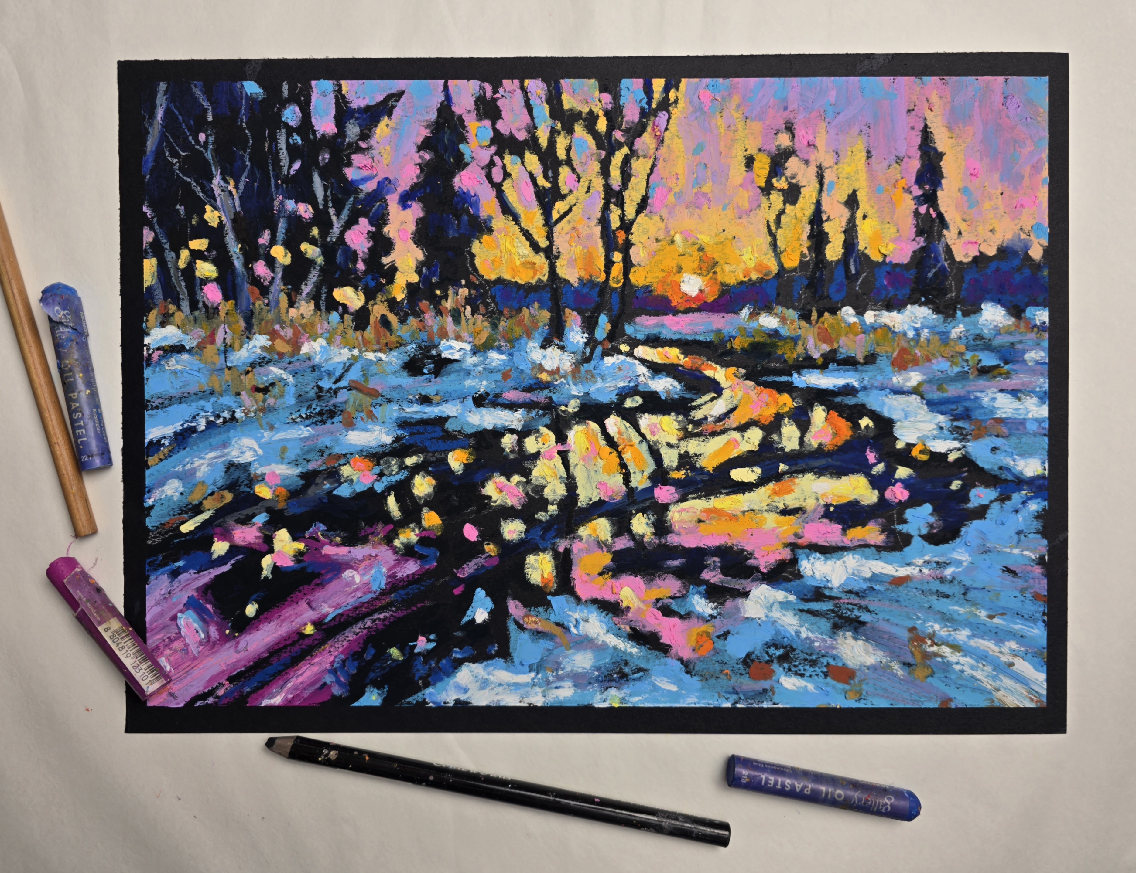🎨"Winter Sunset Reflections" is an original oil pastel painting that captures the magic of a winter evening. The fiery glow of the setting sun spills across the snowy landscape, reflecting in shimmering shades of gold, pink, and violet on the icy ground. Bare trees and dark silhouettes of pines frame the radiant sky, creating a powerful contrast between warmth and cold.